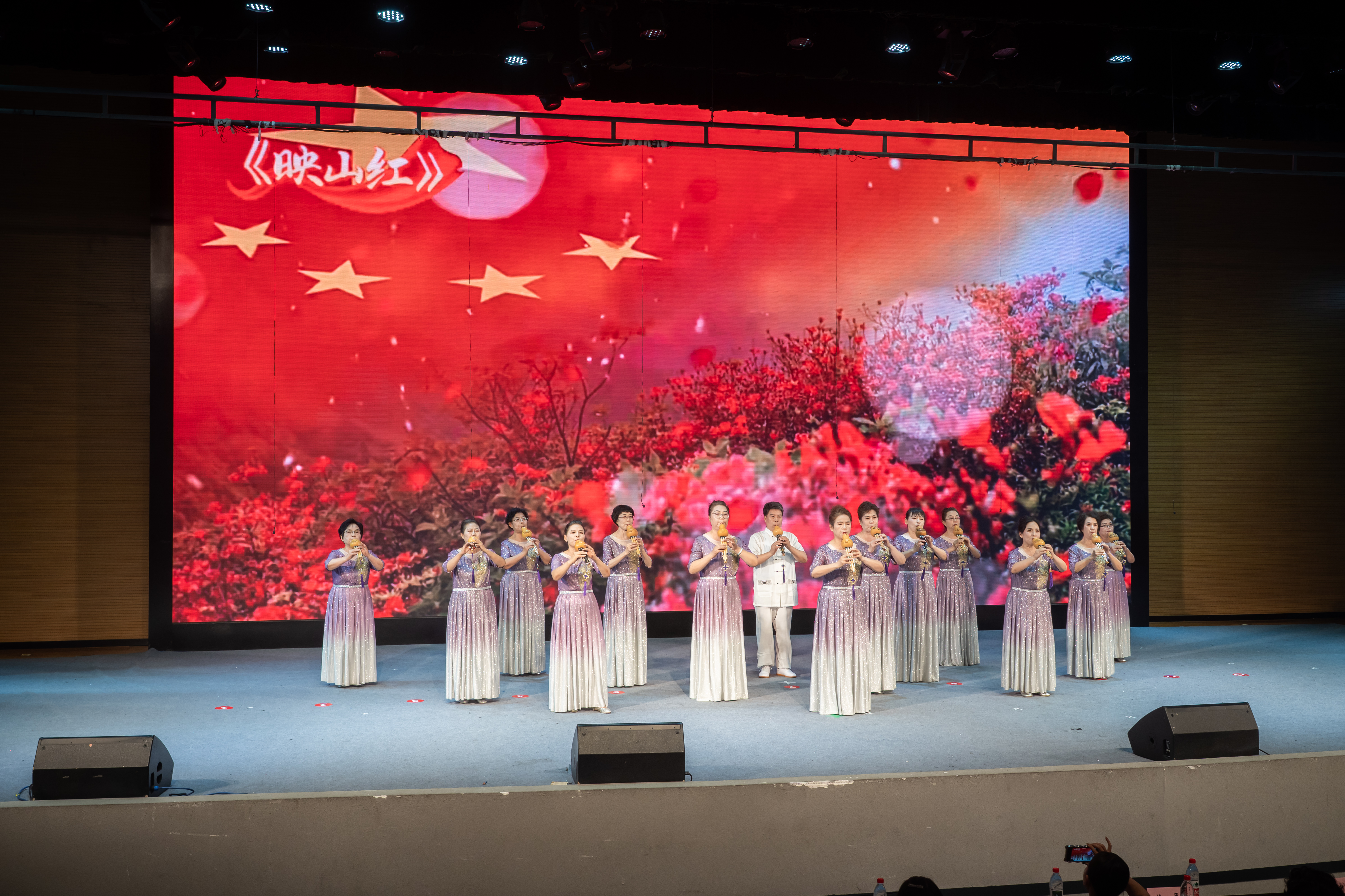 舞蹈、声乐、太极、葫芦丝、模特等教学班次的150余位学员带来了舞蹈、合唱、太极扇、器乐演奏、模特表演等丰富多彩的节目,其间还穿插着以视频形式呈现老年大学书法、素描、国画等班次学员创作的书法、绘画作品。整场演出紧紧围绕庆祝建党104周年暨纪念抗战胜利80周年的主题,精彩的表演引起阵阵热烈的掌声。演出最后,学员代表向辛勤耕耘在老年教学一线的教师代表献花,对老师们的辛勤付出表示衷心感谢。