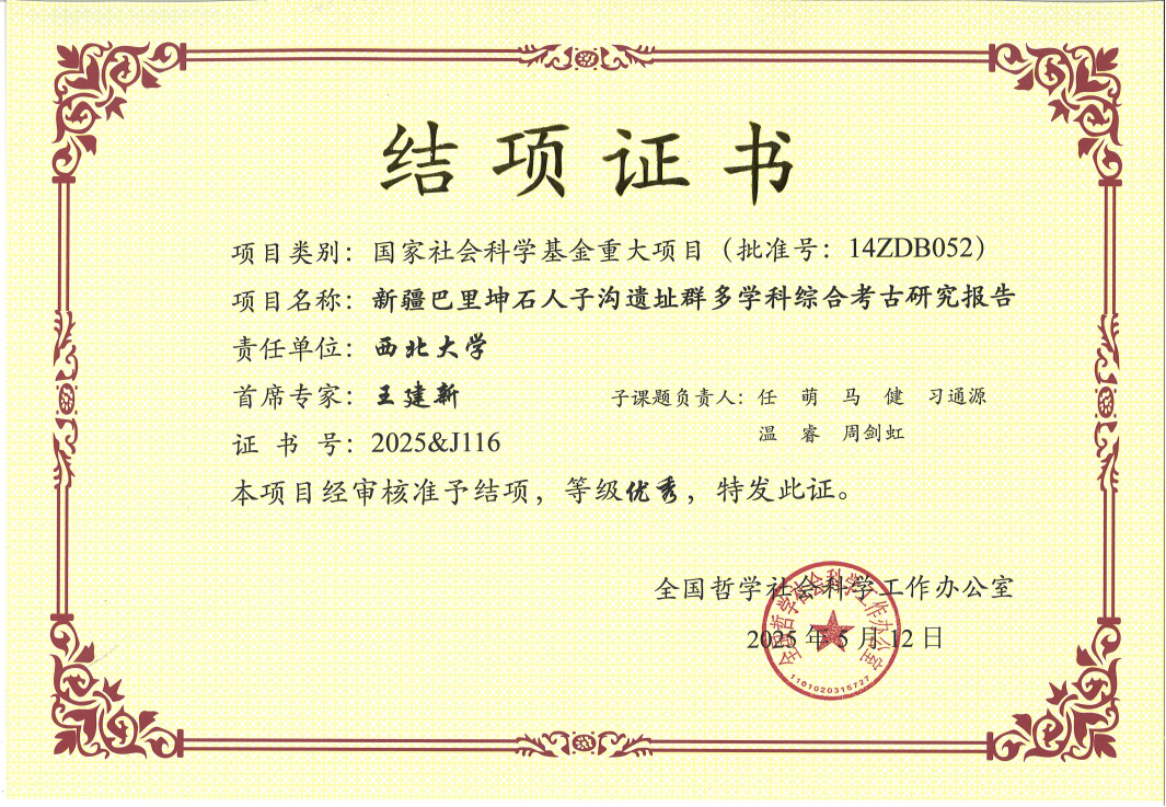 2025年3月,经全国哲学社会科学工作办公室批准,由陕西省社科工作办主持该重大项目的结项鉴定会。会议专家认为,课题组的相关工作构建了东天山地区史前考古学文化时空框架,是多学科研究密切结合的创新成果,进一步丰富完善了古代游牧聚落考古研究的理论和方法体系,是对古代游牧聚落遗址居住遗迹、墓葬和岩画等开展综合研究实践的成果,为探讨早期游牧经济的起源提供了重要新资料,为中国早期文明形成过程与整体格局研究提供了重要依据。