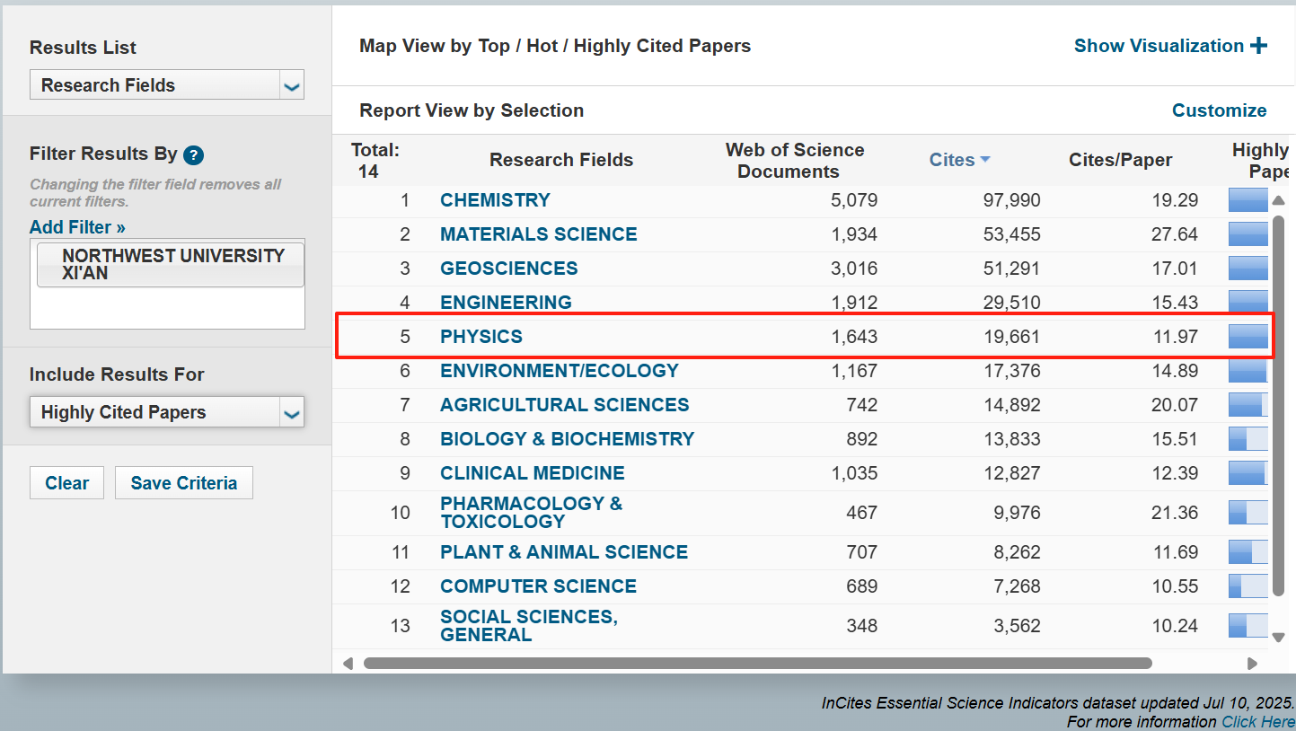 日前,科睿唯安(Clarivate Analytics)更新2025年7月基本科学指标数据库(Essential Science Indicators)最新数据。星空app官网物理学首次进入全球前1%行列,这是学校第十四次党代会后,在学科声誉提升方面取得的又一进展。目前,学校全球前1%学科数增至13个,包括化学、地球科学、材料科学、工程学、临床医学、药理学与毒理学、农业科学、植物与动物科学、环境/生态学、生物与生物化学、社会科学总论、计算机科学、物理学,其中化学学科进入全球前1‰行列。入选学科数并列中国内地高校第55位、在陕高校第3位。