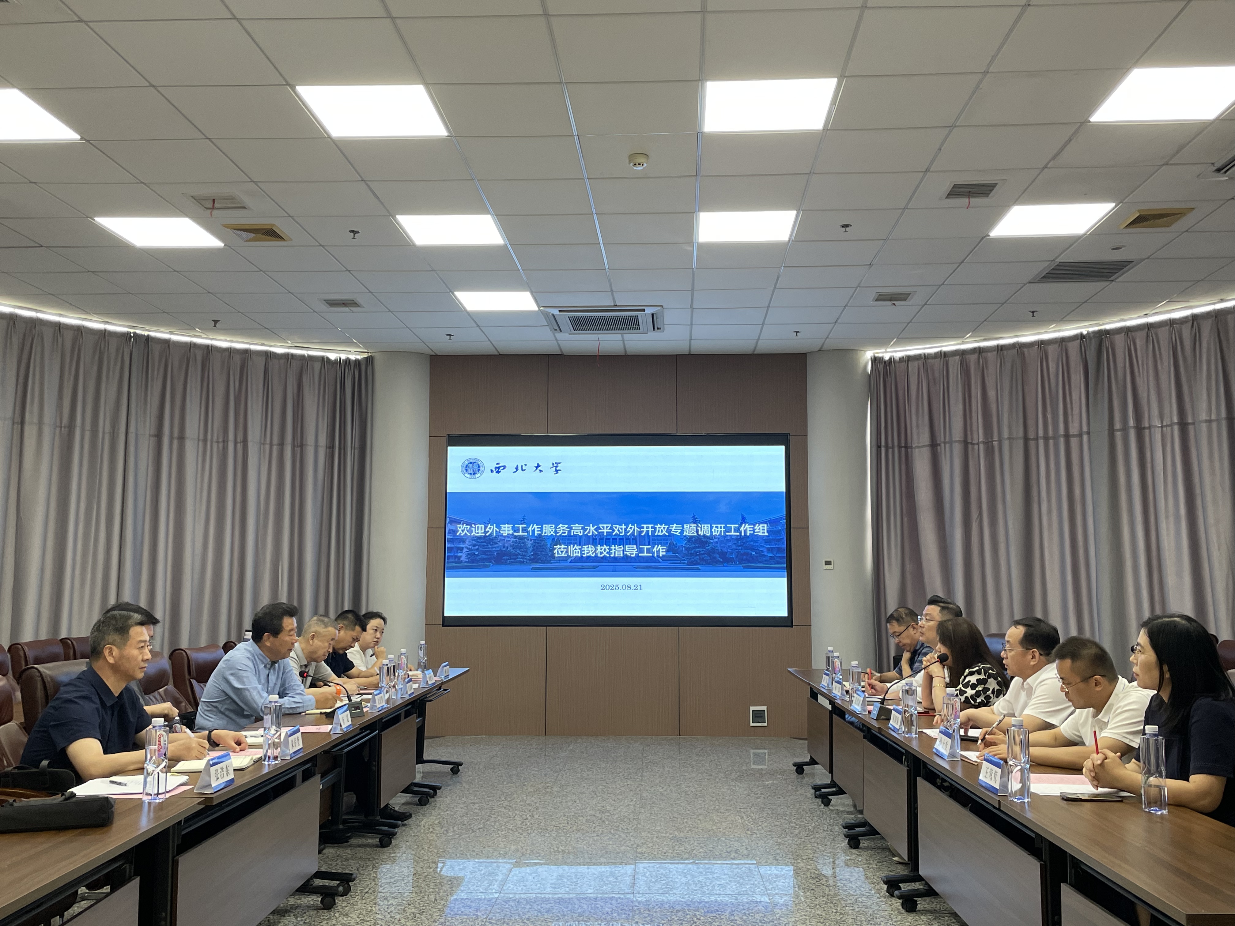 8 月 21 日,陕西省人大常委会委员、民宗侨外工委主任文引学一行来校就外事工作服务高水平对外开放开展专题调研。星空app官网党委常委、副校长范代娣陪同调研并参与座谈,陕西省外办及星空app官网统战部、国际合作部(国际教育学院)、科学技术处、丝绸之路考古合作研究中心相关代表陪同调研并参会。