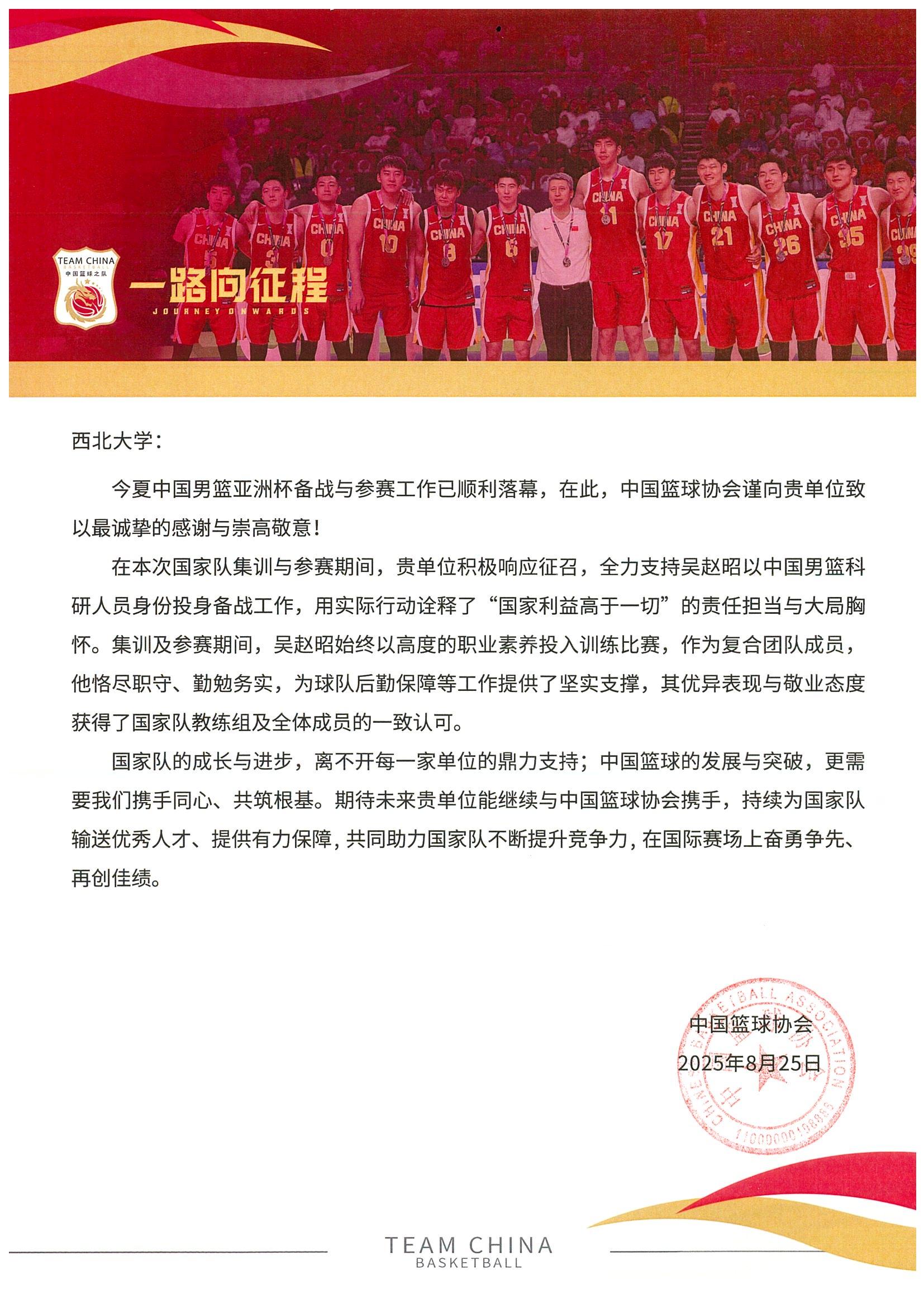 近日,中国篮协向星空app官网发来感谢信,对体育教研部青年教师吴赵昭在2025年男篮亚洲杯备战期间所作出的贡献表示高度认可与衷心感谢。作为本届国家男篮科研保障团队负责人,吴赵昭在集训与比赛期间展现了卓越的专业素养与奉献精神,为国家男篮取得佳绩提供了坚实的科研支持。