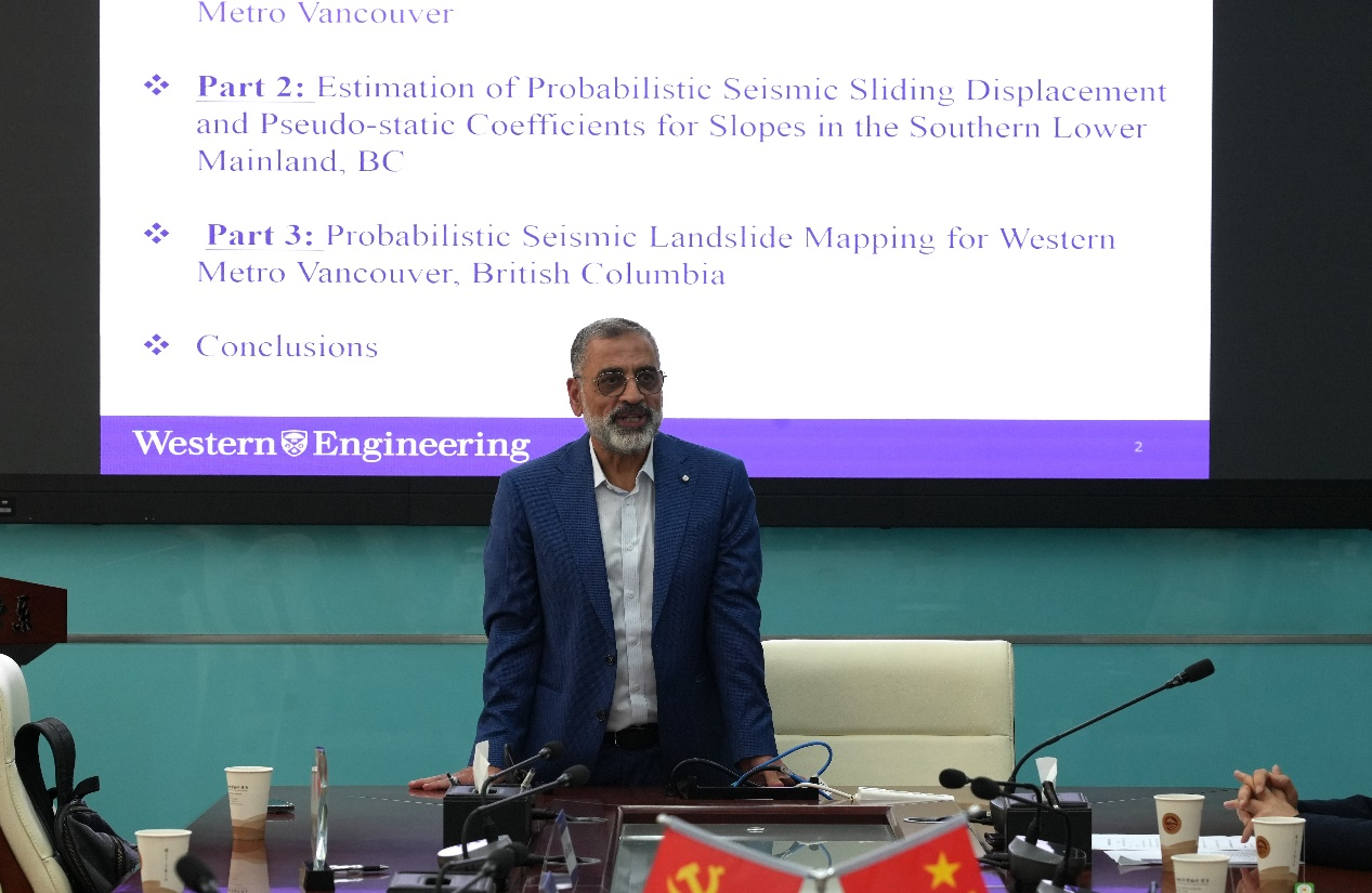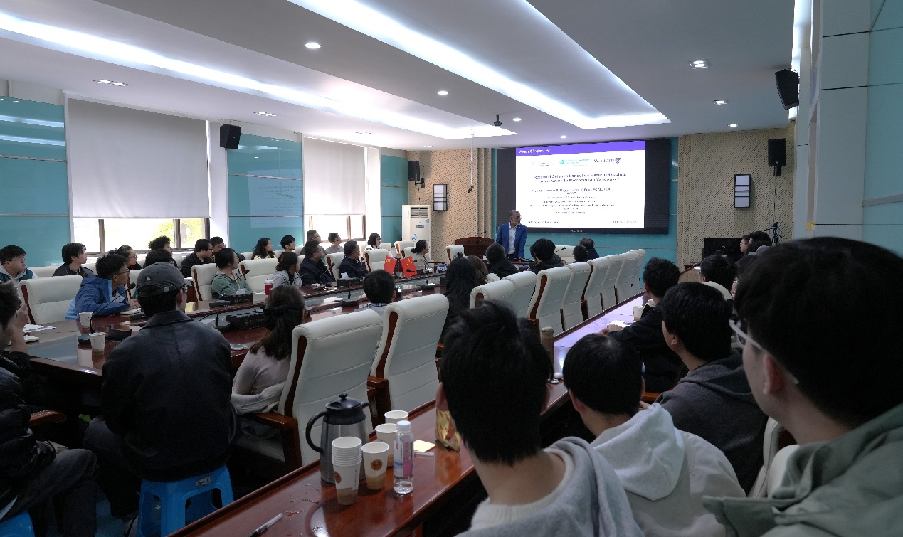 报告中,纳加尔院士介绍了区域尺度下考虑多重震源地震滑坡位移概率解方法(SDPMs)的最新进展。他讲道,在同时考虑输入地震参数与地震位移预测模型(SDPMs)的情况下,针对不同屈服加速度值(ky)及滑体初始主频率值(fs)可确定概率位移值。他介绍了通过回归分析建立区域预测模型,用于估算不同边坡条件(即 ky与fs值)在 50 年超越2%概率灾害水平的概率位移值的方法,并以加拿大温哥华地区为例,向师生们讲述了应用区域地震滑坡位移模型为边坡分配相应位移值,绘制概率地震滑坡灾害分布图的过程。