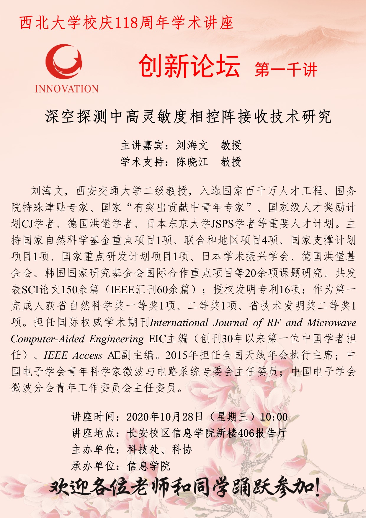 刘海文 教授 星空app官网创新论坛第一千讲暨校庆118周年学术讲座:深空探测中高灵敏度相控阵接收技术研究 讲座时间 2020年10月28日(星期三)10:00 讲座地点 长安校区信息学院新楼406报告厅 讲座人介绍 刘海文 教授 讲座内容