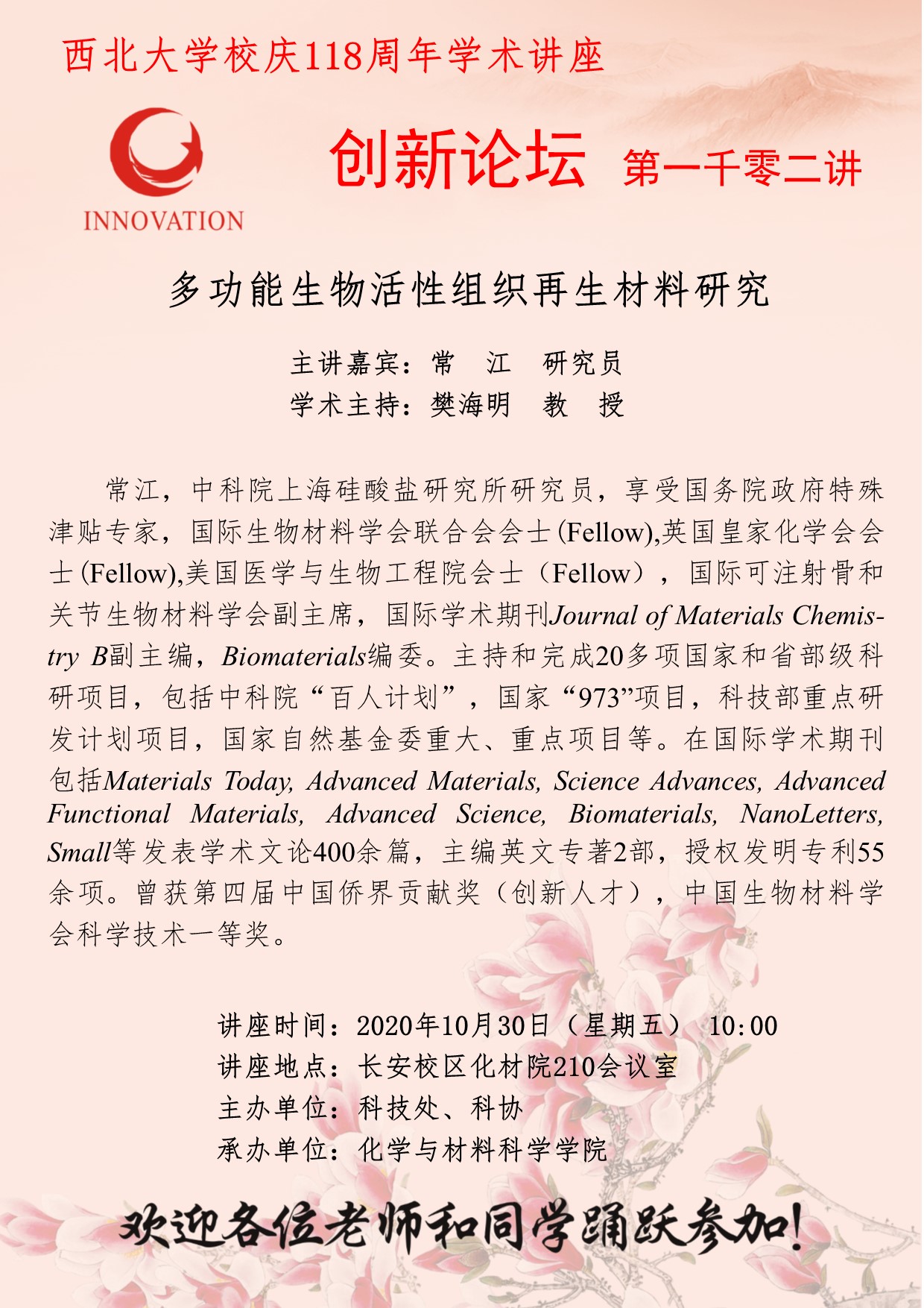 常江 研究员 星空app官网创新论坛第一千零二讲暨校庆118周年学术讲座:多功能生物活性组织再生材料研究 讲座时间 2020年10月30日(星期五)10:00 讲座地点 化学与材料科学学院210室 讲座人介绍 常江 研究员 讲座内容