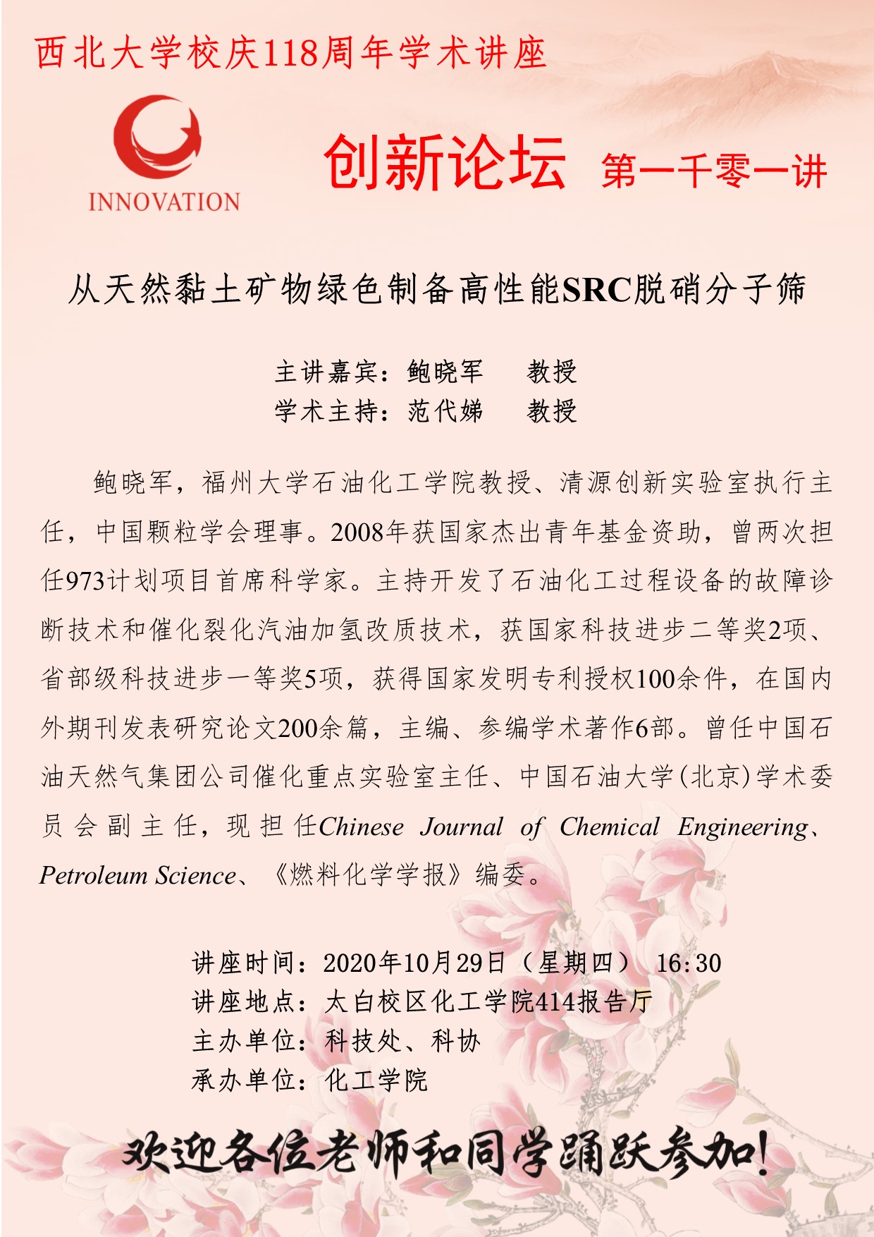 鲍晓军 教授 星空app官网创新论坛第一千零一讲暨校庆118周年学术讲座:从天然黏土矿物绿色制备高性能SRC脱硝分子筛 讲座时间 2020年10月29日(星期四) 16:30 讲座地点 太白校区化工学院414报告厅 讲座人介绍 鲍晓军 教授 讲座内容