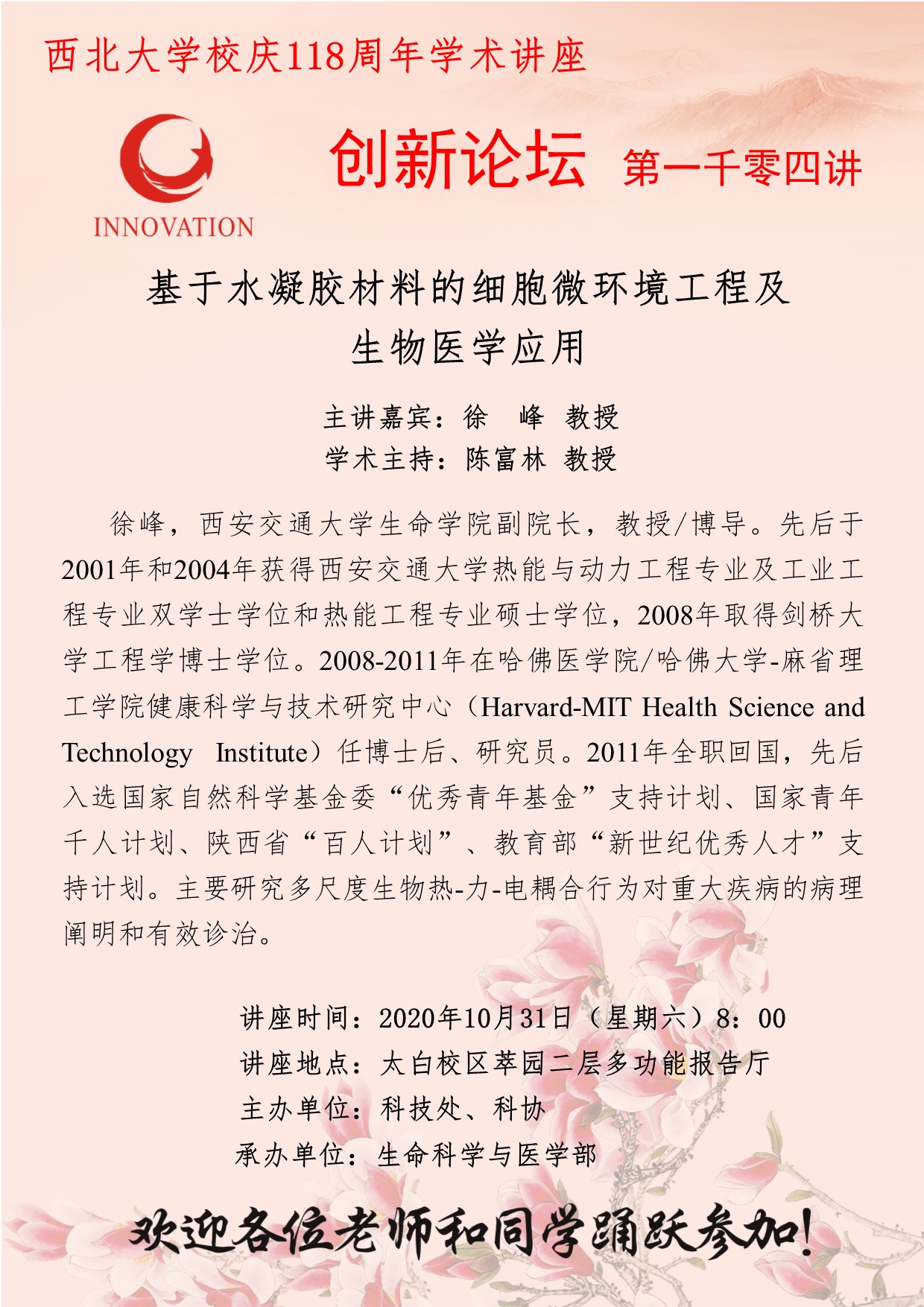 徐峰 教授 星空app官网创新论坛第一千零四讲暨校庆118周年学术讲座:基于水凝胶材料的细胞微环境工程及生物医学应用 讲座时间 2020年10月31日(星期六)8:00 讲座地点 太白校区萃园二层多功能报告厅 讲座人介绍 徐峰 教授 讲座内容
