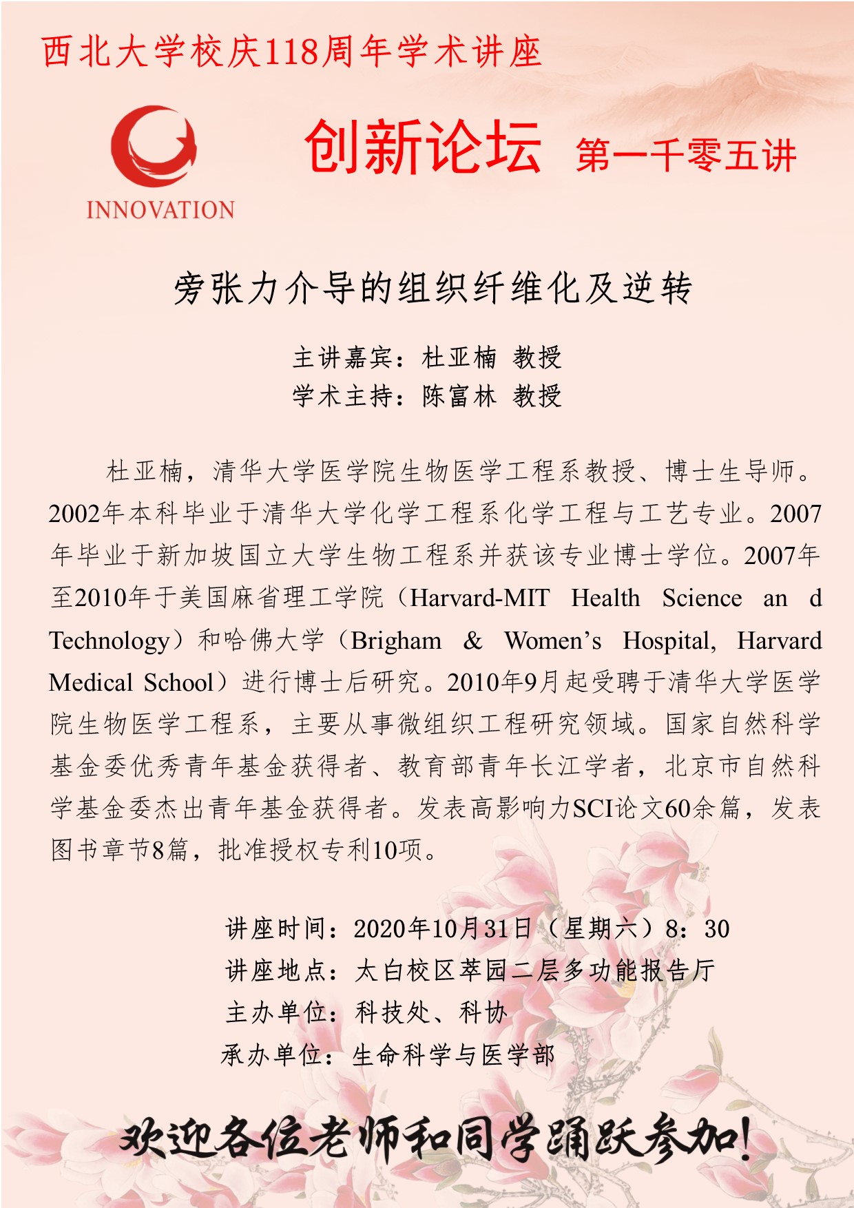 杜亚楠 教授 星空app官网创新论坛第一千零五讲暨校庆118周年学术讲座:旁张力介导的组织纤维化及逆转 讲座时间 2020年10月31日(星期六)8:30 讲座地点 太白校区萃园二层多功能报告厅 讲座人介绍 杜亚楠 教授 讲座内容