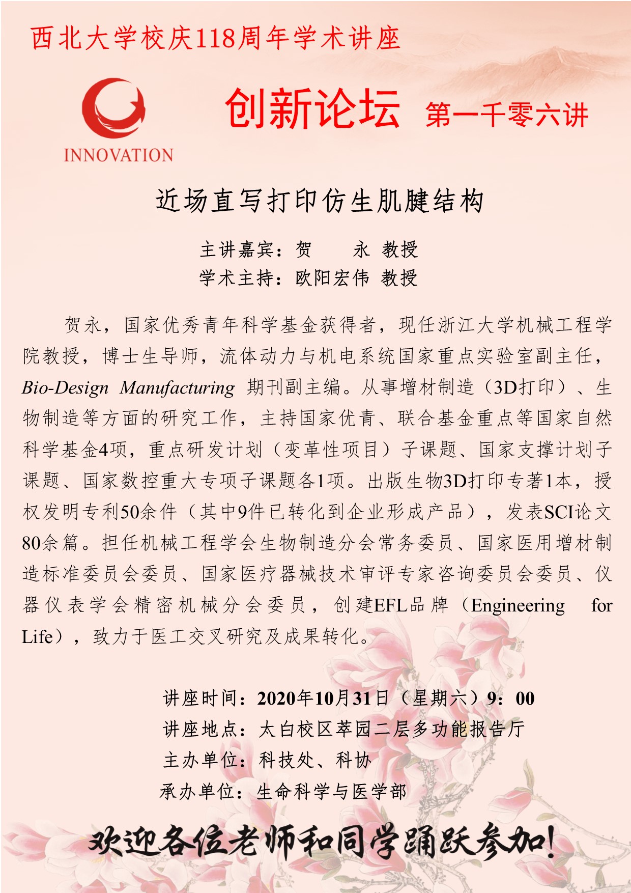贺永 教授 星空app官网创新论坛第一千零六讲暨校庆118周年学术讲座:近场直写打印仿生肌腱结构 讲座时间 2020年10月31日(星期六)9:00 讲座地点 太白校区萃园二层多功能报告厅 讲座人介绍 贺永 教授 讲座内容