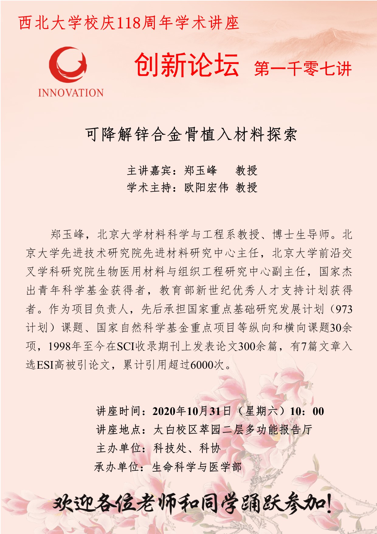郑玉峰 教授 星空app官网创新论坛第一千零七讲暨校庆118周年学术讲座:可降解锌合金骨植入材料探索 讲座时间 2020年10月31日(星期六)10:00 讲座地点 太白校区萃园二层多功能报告厅 讲座人介绍 郑玉峰 教授 讲座内容