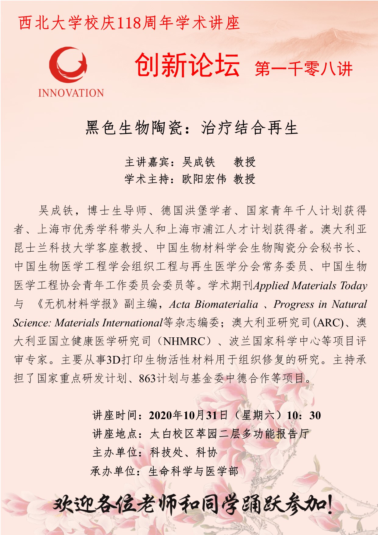 吴成铁 教授 星空app官网创新论坛第一千零八讲暨校庆118周年学术讲座:黑色生物陶瓷:治疗结合再生 讲座时间 2020年10月31日(星期六)10:30 讲座地点 太白校区萃园二层多功能报告厅 讲座人介绍 吴成铁 教授 讲座内容