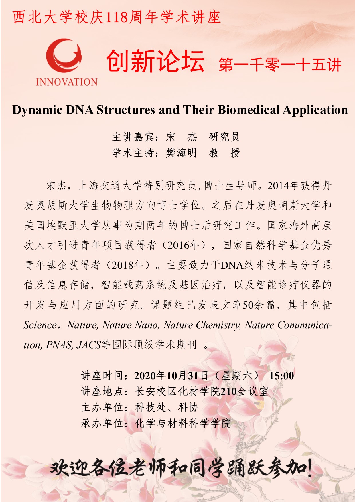 宋杰 研究员 星空app官网创新论坛第一千零一十五讲暨校庆118周年学术讲座:Dynamic DNA Structures and Their Biomedical Application 讲座时间 2020年10月31日(星期六)15:00 讲座地点 化学与材料科学学院210室 讲座人介绍 宋杰 研究员 讲座内容