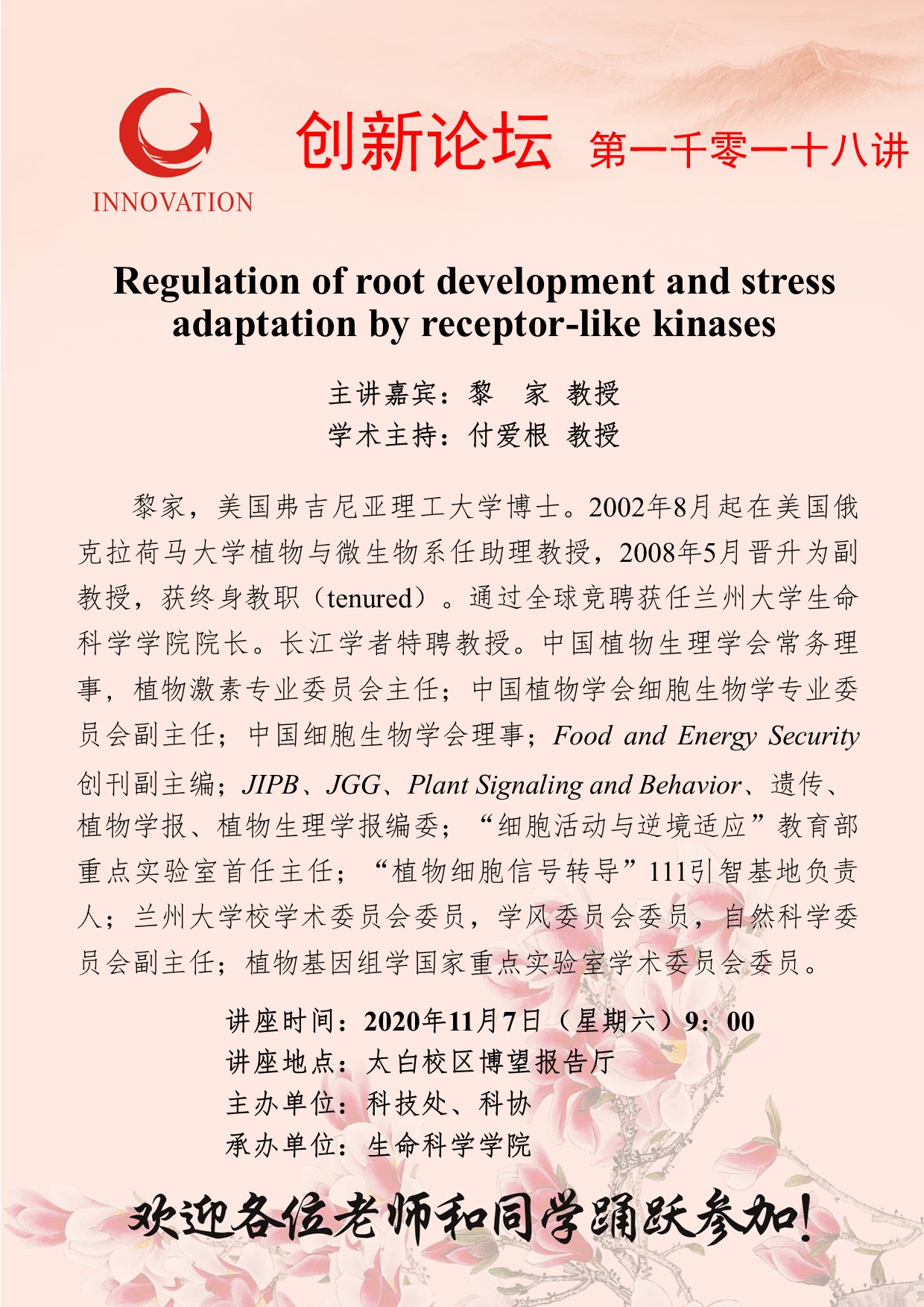 黎 家 教授 星空app官网创新论坛第一千零一十八讲:Regulation of root development and stress adaptation by receptor-like kinases 讲座时间 2020年11月7日(星期六)9:00 讲座地点 太白校区博望报告厅 讲座人介绍 黎 家 教授 讲座内容
