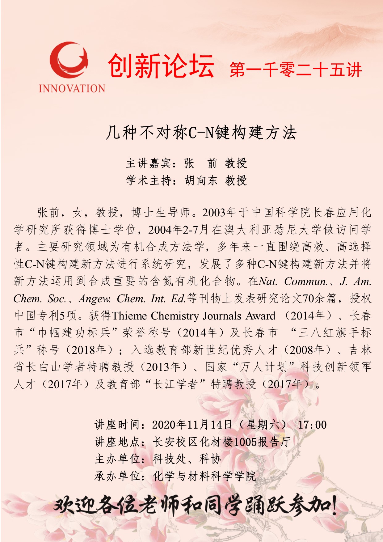 张前 教授 星空app官网创新论坛第一千零二十五讲:几种不对称C-N键构建方法 讲座时间 2020年11月14日(周六)17:00 讲座地点 长安校区化材楼1005报告厅 讲座人介绍 张前 教授 讲座内容