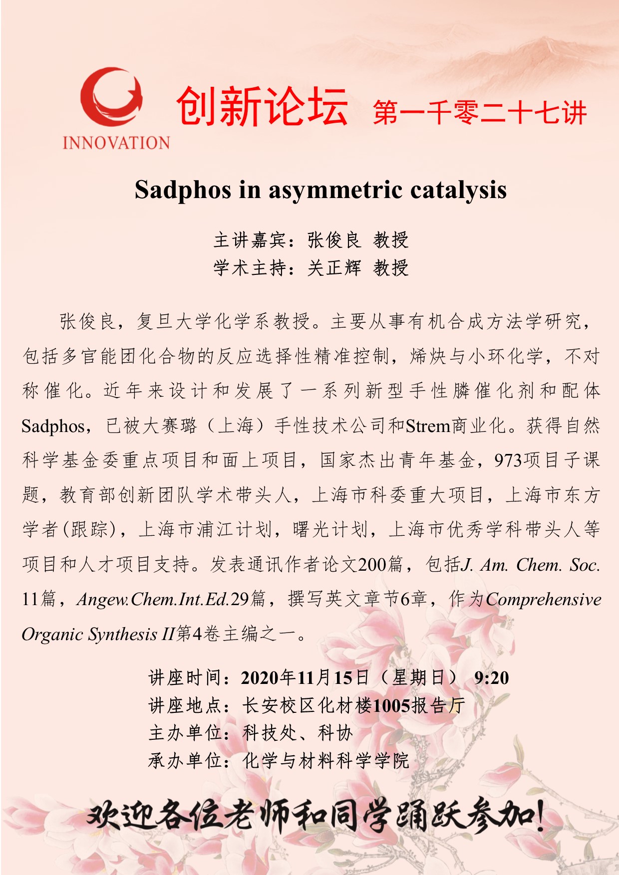 张俊良 教授 星空app官网创新论坛第一千零二十七讲:Sadphos in asymmetric catalysis 讲座时间 2020年11月15日(星期日)9:20 讲座地点 长安校区化材楼1005报告厅 讲座人介绍 张俊良 教授 讲座内容