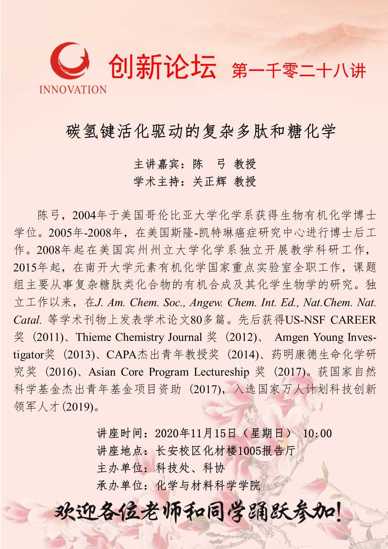 陈 弓 教授 星空app官网创新论坛第一千零二十八讲:碳氢键活化驱动的复杂多肽和糖化学 讲座时间 2020年 11月15日(星期日)10:00 讲座地点 长安校区化材楼1005报告厅 讲座人介绍 陈 弓 教授 讲座内容