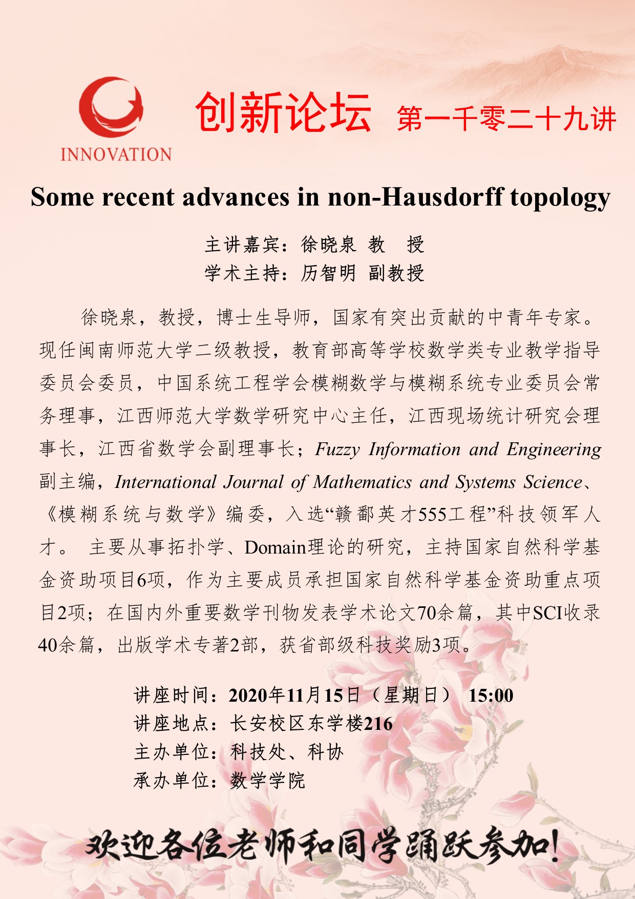 徐晓泉 教授 星空app官网创新论坛第一千零二十九讲:Some recent advances in non-Hausdorff topology 讲座时间 2020年11月15日(星期日) 15:00 讲座地点 长安校区东学楼216 讲座人介绍 徐晓泉 教授 讲座内容
