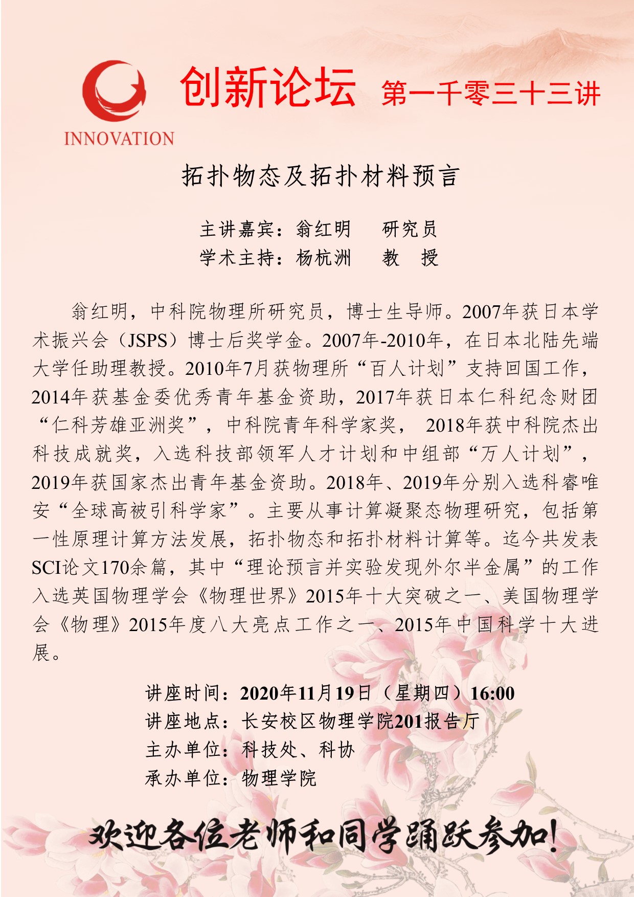 翁红明 研究员 星空app官网创新论坛第一千零三十三讲:拓扑物态及拓扑材料预言 讲座时间 2020年11月19日(星期四)16:00 讲座地点 长安校区物理学院201报告厅 讲座人介绍 翁红明 研究员 讲座内容