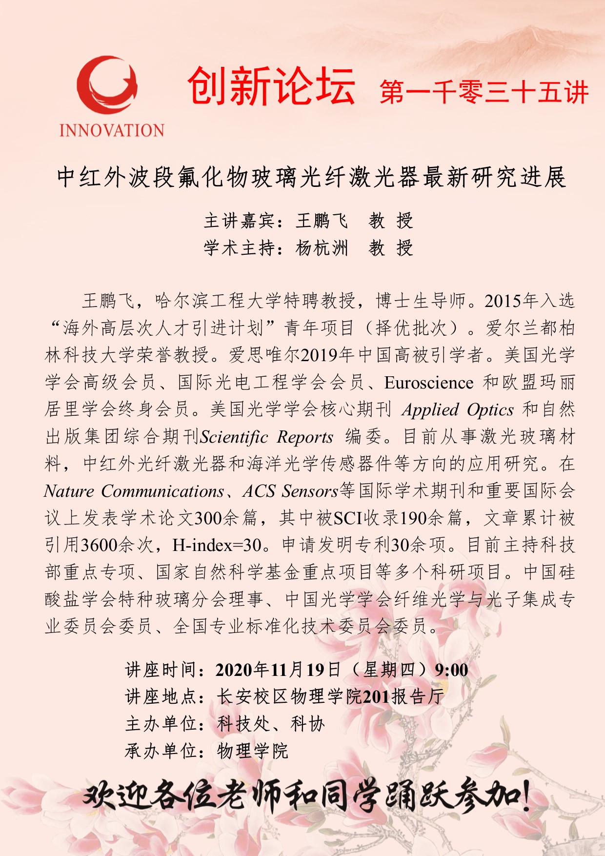 王鹏飞 教授 星空app官网创新论坛第一千零三十五讲:中红外波段氟化物玻璃光纤激光器最新研究进展 讲座时间 2020年11月19日(星期四) 9:00 讲座地点 长安校区物理学院201报告厅 讲座人介绍 王鹏飞 教授 讲座内容