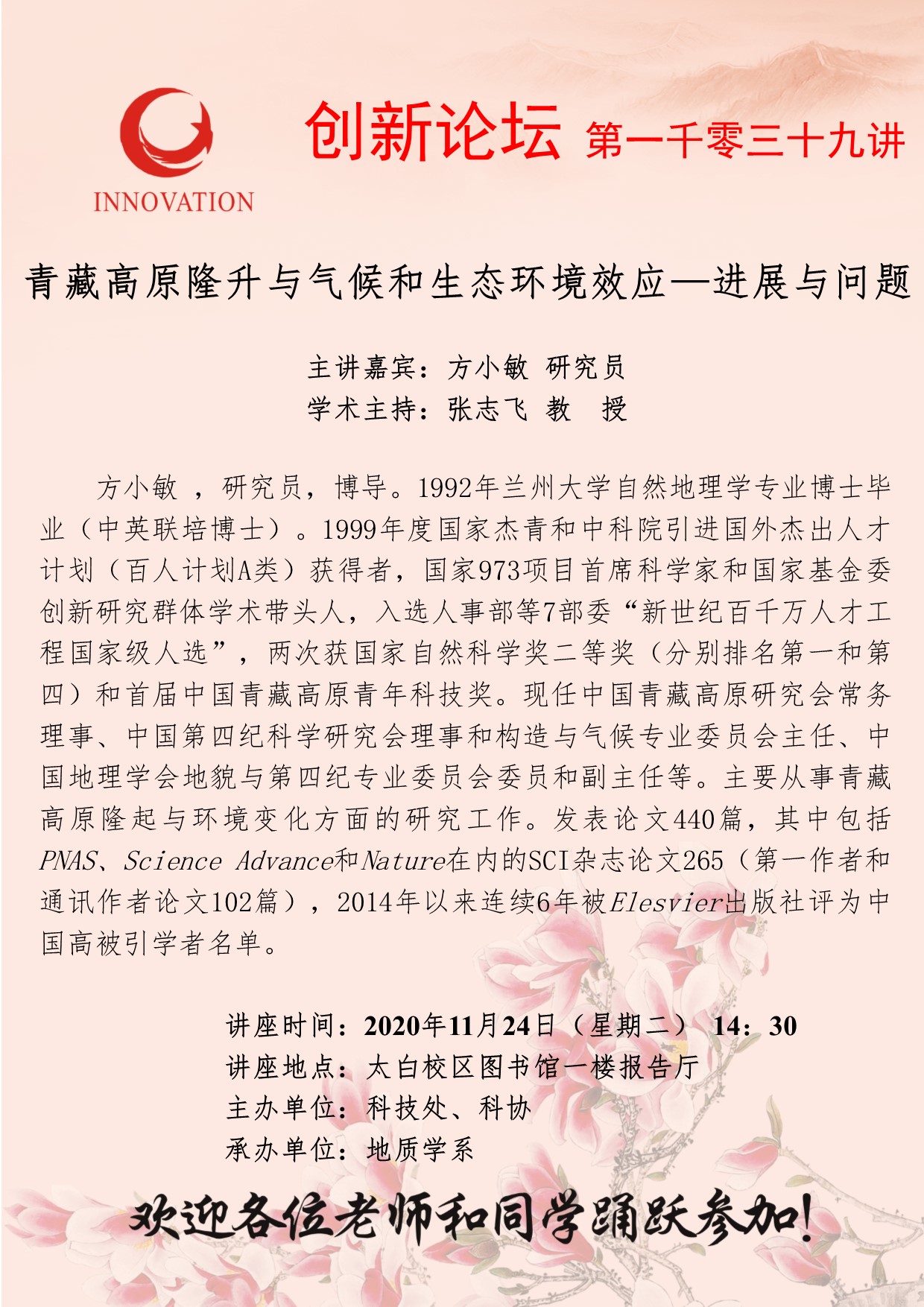 方小敏 研究员 星空app官网创新论坛第一千零三十九讲:青藏高原隆升与气候和生态环境效应—进展与问题 讲座时间 2020年11月24日(星期二)14:30 讲座地点 太白校区图书馆一楼报告厅 讲座人介绍 方小敏 研究员 讲座内容