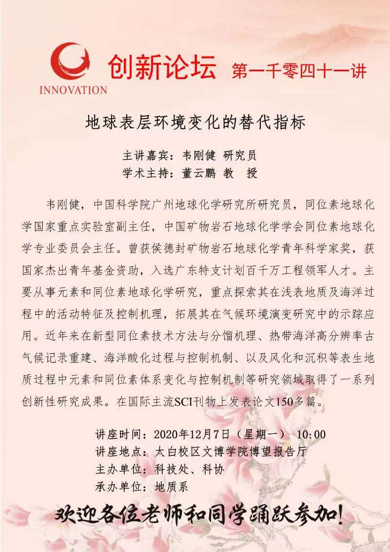 韦刚健 研究员 星空app官网创新论坛第一千零四十一讲:地球表层环境变化的替代指标 讲座时间 2020年12月7日(星期一) 10:00 讲座地点 太白校区文博学院博望报告厅 讲座人介绍 韦刚健 研究员 讲座内容