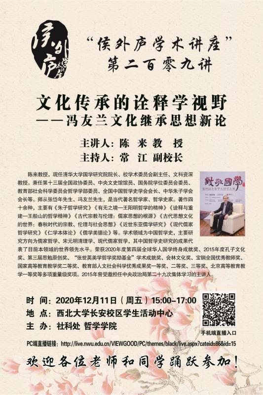 陈 来 教 授 侯外庐学术讲座第二百零九讲:文化传承的诠释学视野——冯友兰文化继承思想新论 讲座时间 2020年12月11日(周五)15:00-17:00 讲座地点 星空app官网长安校区学生活动中心 讲座人介绍 陈 来 教 授 讲座内容
