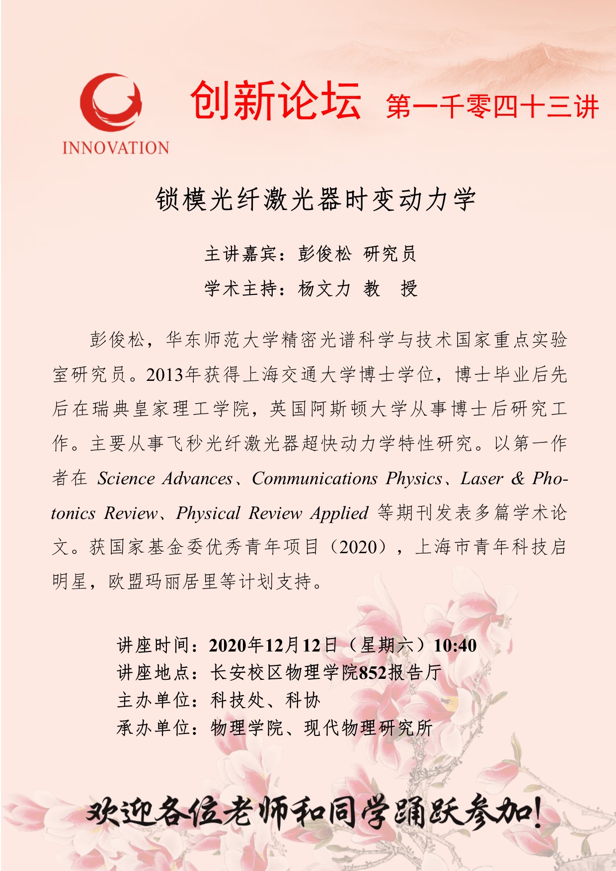 彭俊松 研究员 星空app官网创新论坛第一千零四十三讲:锁模光纤激光器时变动力学 讲座时间 2020年12月12日(星期六)10:40 讲座地点 长安校区物理学院852报告厅 讲座人介绍 彭俊松 研究员 讲座内容