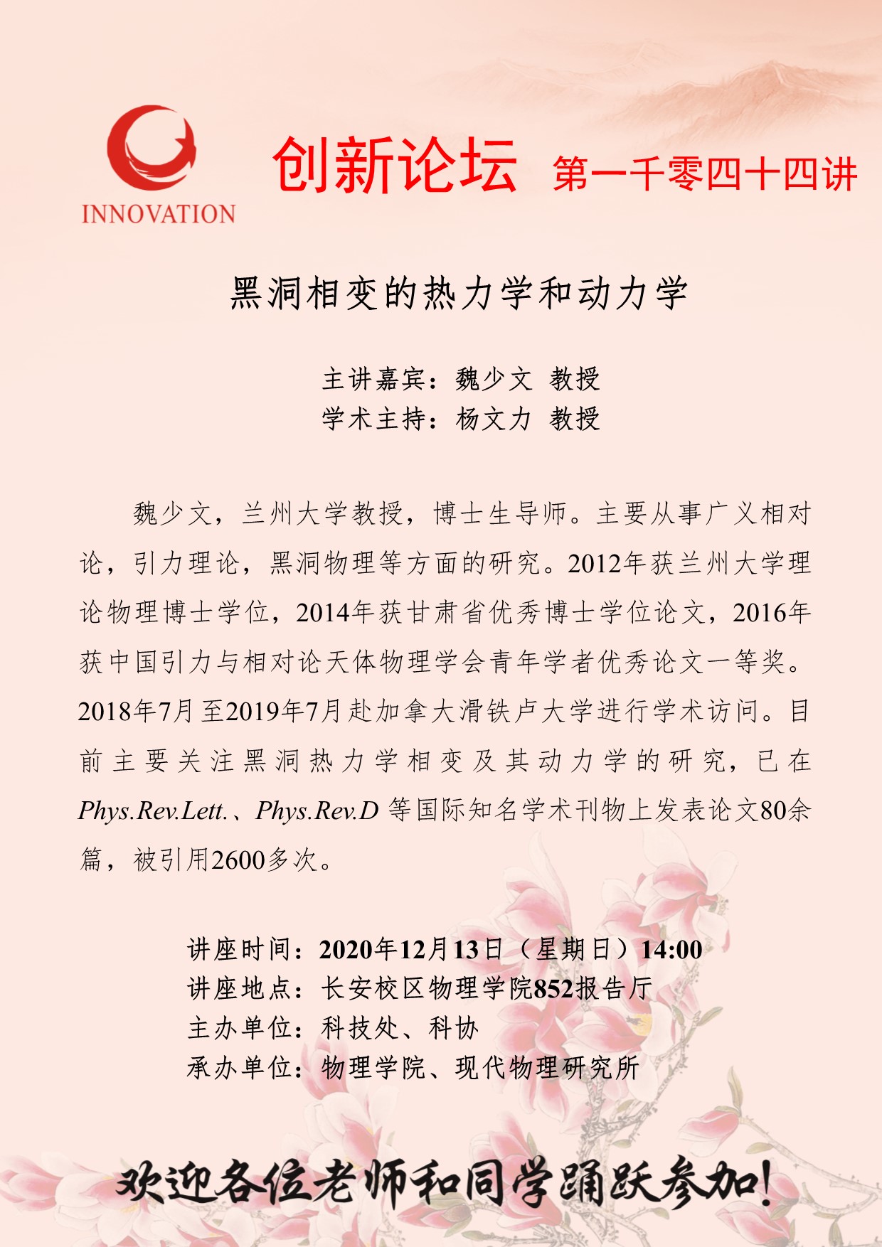 魏少文 教授 星空app官网创新论坛第一千零四十四讲:黑洞相变的热力学和动力学 讲座时间 2020年12月13日(星期日)14:00 讲座地点 长安校区物理学院852报告厅 讲座人介绍 魏少文 教授 讲座内容