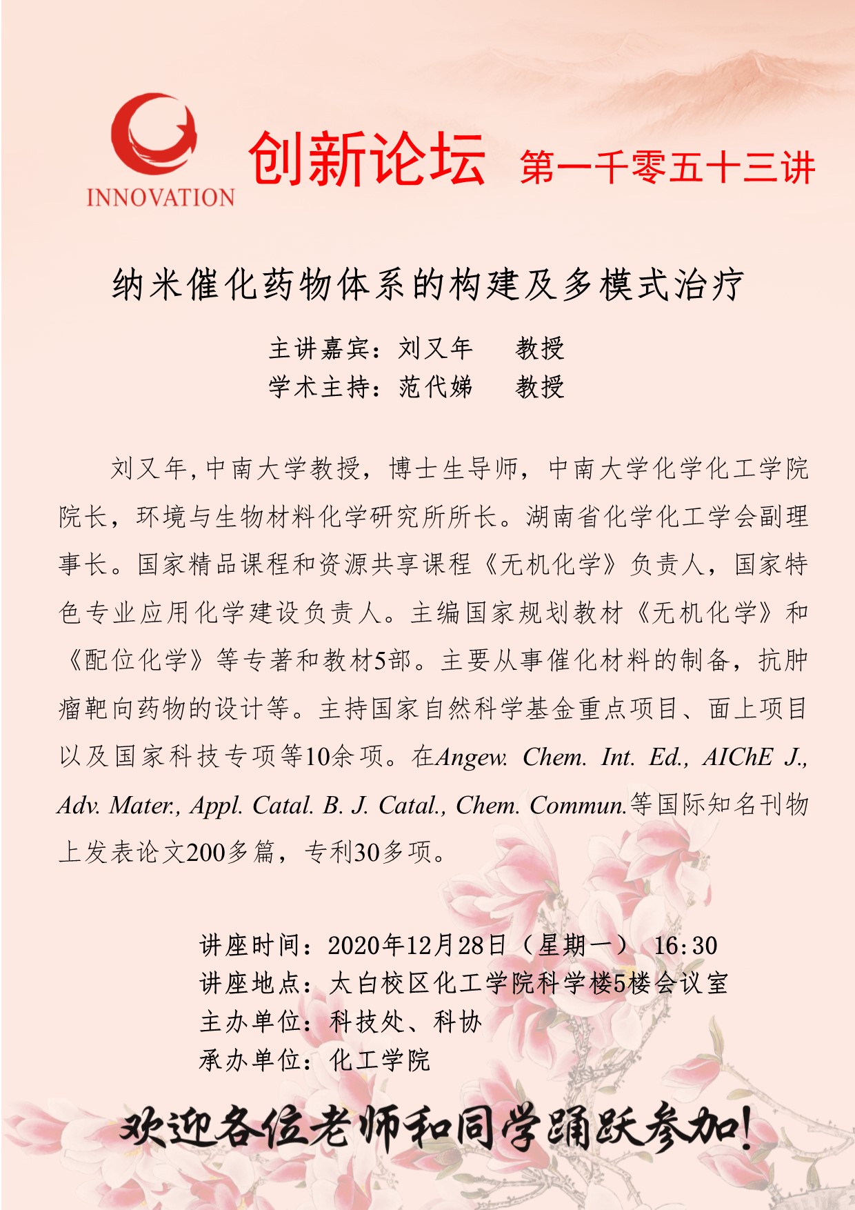 刘又年 教授 星空app官网创新论坛第一千零五十三讲:纳米催化药物体系的构建及多模式治疗 讲座时间 2020年12月28日(星期一) 16:30 讲座地点 太白校区化工学院科学楼5楼会议室 讲座人介绍 刘又年 教授 讲座内容