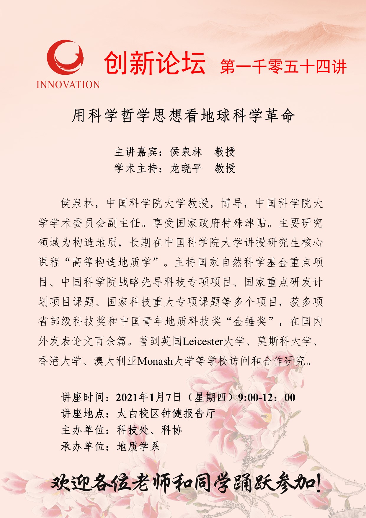 侯泉林 教授 星空app官网创新论坛第一千零五十四讲:用科学哲学思想看地球科学革命 讲座时间 2021年1月7日(星期四) 9:00-12:00 讲座地点 太白校区钟健报告厅 讲座人介绍 侯泉林 教授 讲座内容