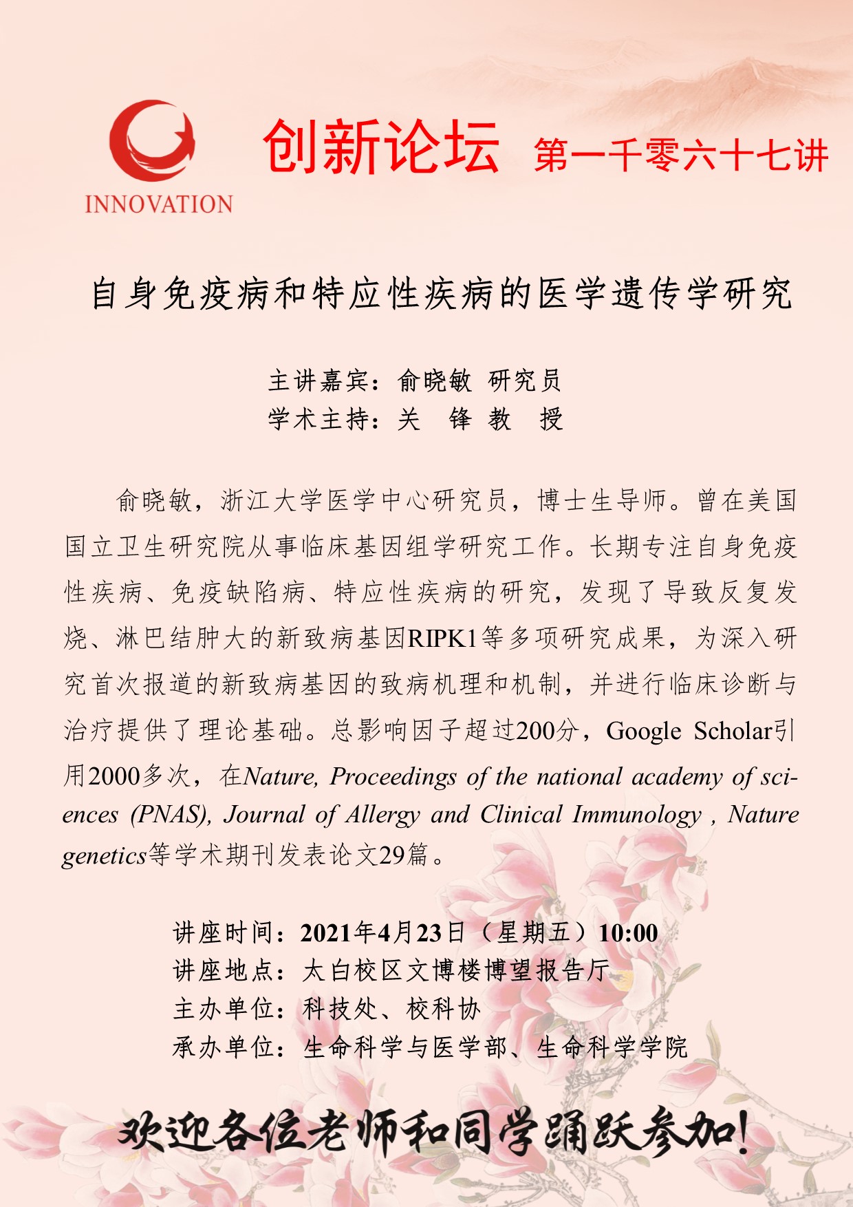 俞晓敏 研究员 星空app官网创新论坛第一千零六十七讲:自身免疫病和特应性疾病的医学遗传学研究 讲座时间 2021年4月23日(星期五)10:00 讲座地点 太白校区文博楼博望报告厅 讲座人介绍 俞晓敏 研究员 讲座内容