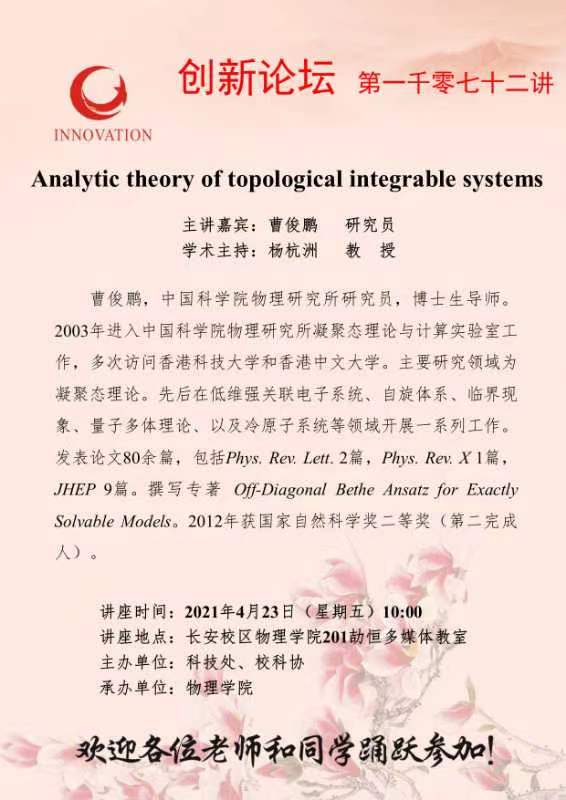 曹俊鹏 研究员 星空app官网创新论坛第一千零七十二讲:Analytic theory of topological integrable systems 讲座时间 2021年4月23日(星期五)10:00 讲座地点 长安校区物理学院201劼恒多媒体教室 讲座人介绍 曹俊鹏 研究员 讲座内容