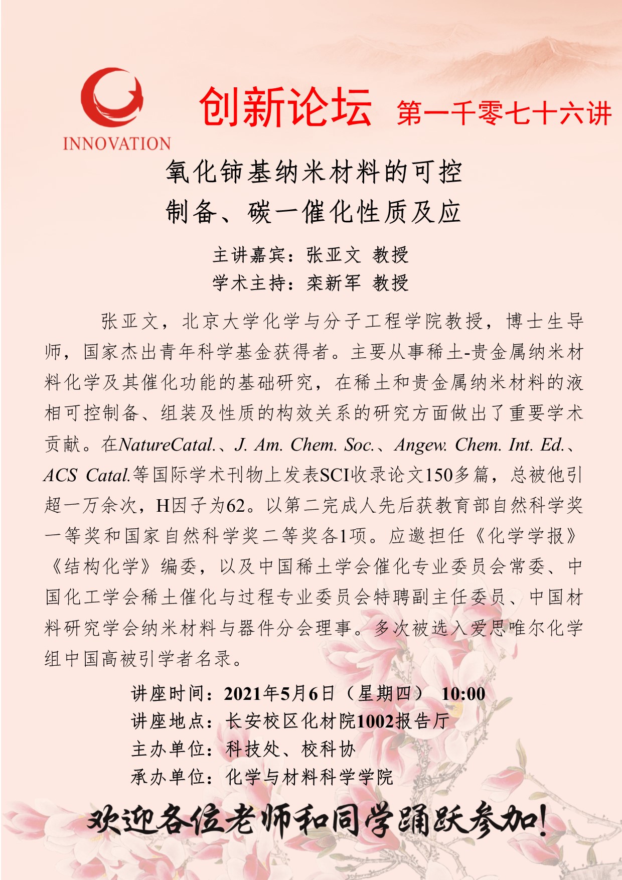 张亚文 教授 星空app官网创新论坛第一千零七十六讲:氧化铈基纳米材料的可控制备、碳一催化性质及应用 讲座时间 2021年5月6日(星期四) 10:00 讲座地点 长安校区化材院1002报告厅 讲座人介绍 张亚文 教授 讲座内容
