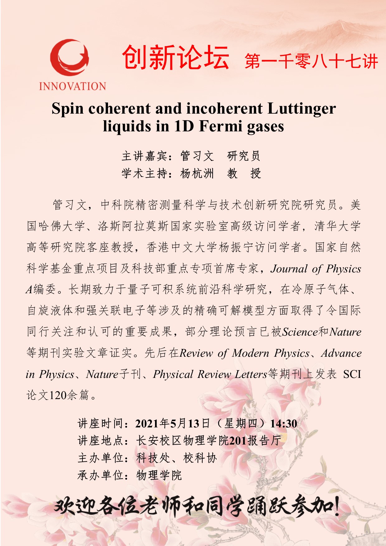 管习文 研究员 星空app官网创新论坛第一千零八十七讲:Spin coherent and incoherent Luttinger liquids in 1D Fermi gases 讲座时间 2021年5月13日(星期四)14:30 讲座地点 长安校区物理学院201报告厅 讲座人介绍 管习文 研究员 讲座内容