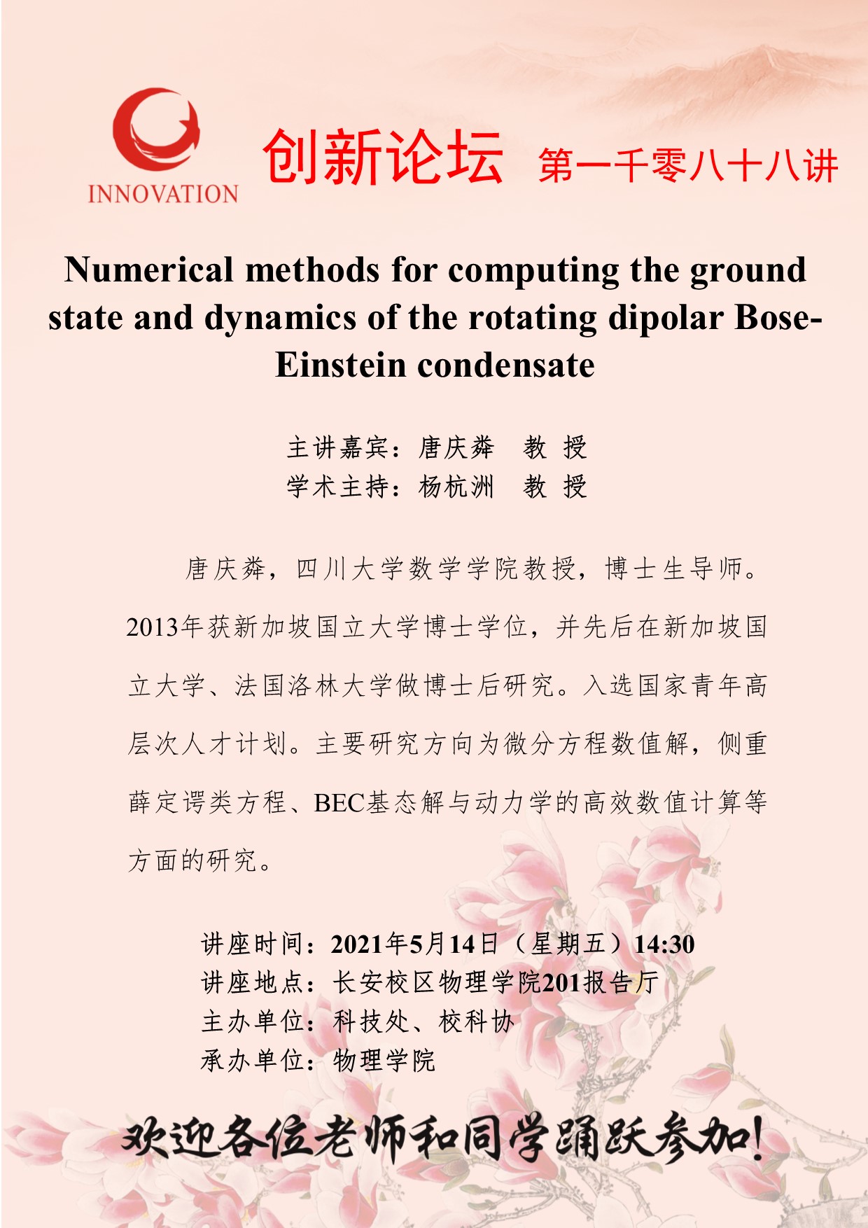 唐庆粦 教 授 星空app官网创新论坛第一千零八十八讲:Numerical methods for computing the ground state and dynamics of the rotating dipolar Bose-Einstein condensate 讲座时间 2021年5月14日(星期五)14:30 讲座地点 长安校区物理学院201报告厅 讲座人介绍 唐庆粦 教 授 讲座内容