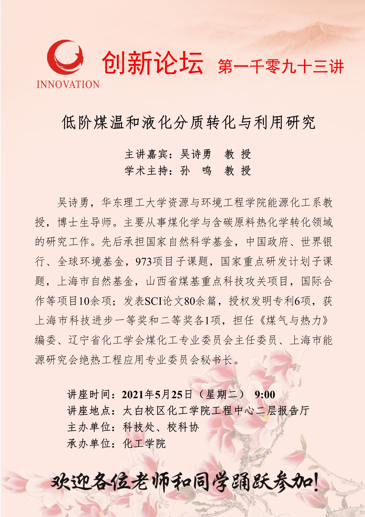 吴诗勇 教 授 星空app官网创新论坛第一千零九十三讲:低阶煤温和液化分质转化与利用研究 讲座时间 2021年5月25日(星期二) 9:00 讲座地点 太白校区化工学院工程中心二层报告厅 讲座人介绍 吴诗勇 教 授 讲座内容