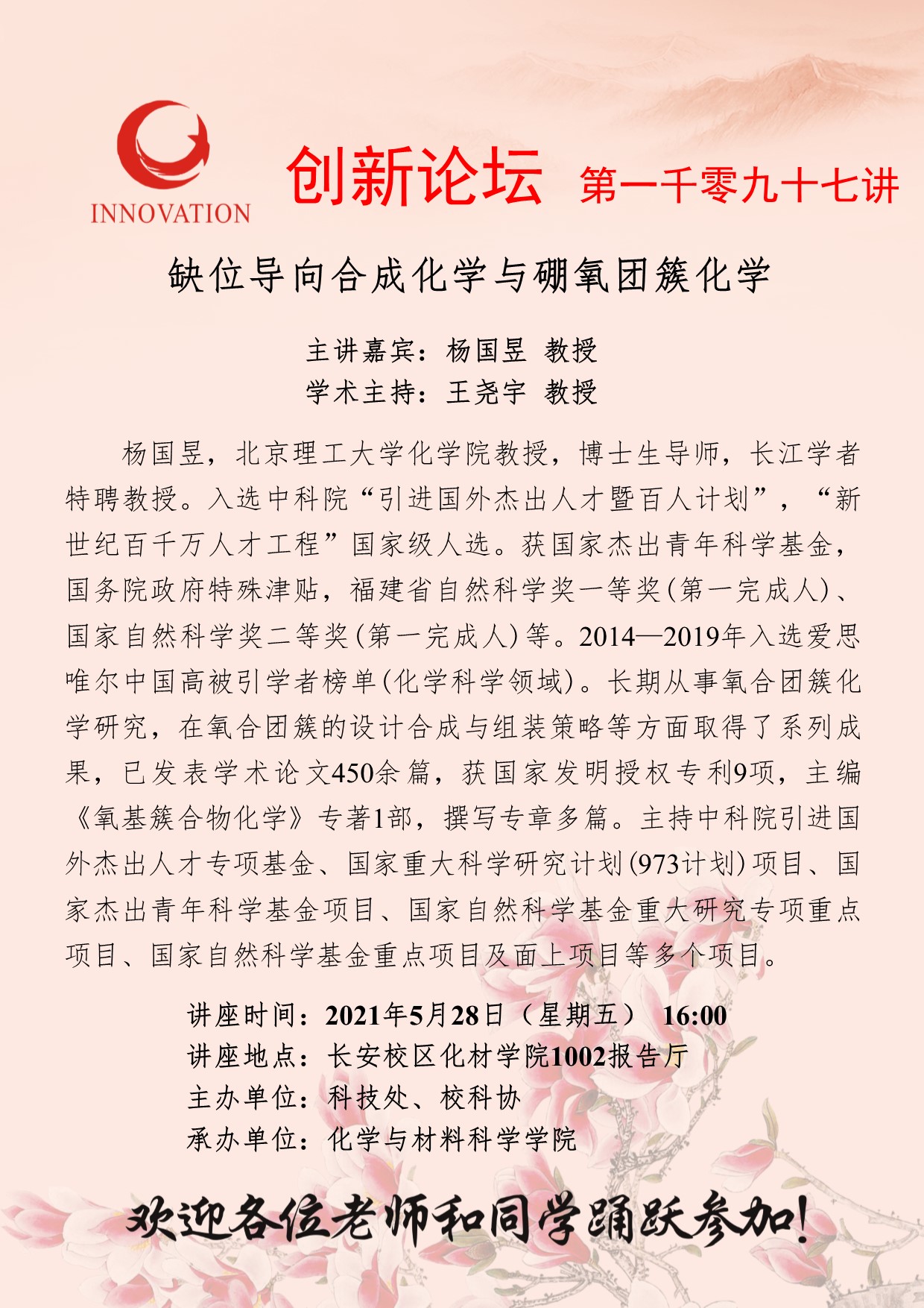 杨国昱 教授 星空app官网创新论坛第一千零九十七讲:缺位导向合成化学与硼氧团簇化学 讲座时间 2021年5月28日(星期五) 16:00 讲座地点 长安校区化材学院1002报告厅 讲座人介绍 杨国昱 教授 讲座内容