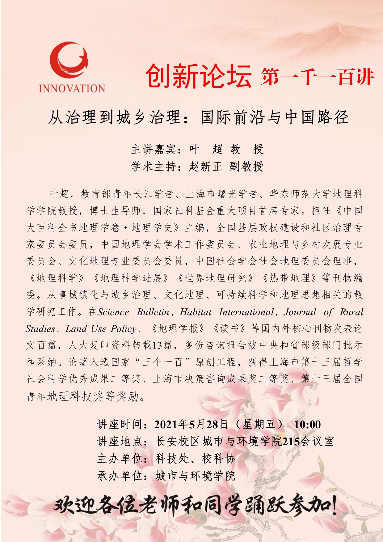 叶超 教授 星空app官网创新论坛第一千一百讲:从治理到城乡治理:国际前沿与中国路径 讲座时间 2021年5月28日(星期五)10:00 讲座地点 长安校区城市与环境学院215会议室 讲座人介绍 叶超 教授 讲座内容