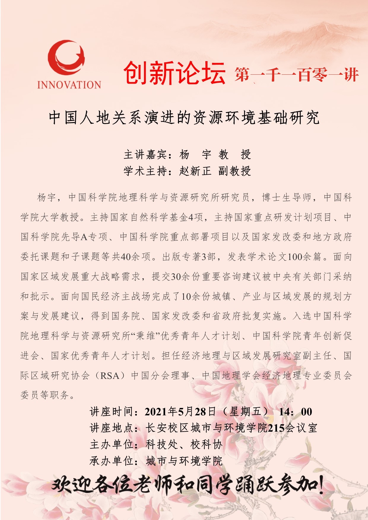 杨宇 教授 星空app官网创新论坛第一千一百零一讲:中国人地关系演进的资源环境基础研究 讲座时间 2021年5月28日(星期五)14:00 讲座地点 长安校区城市与环境学院215会议室 讲座人介绍 杨宇 教授 讲座内容
