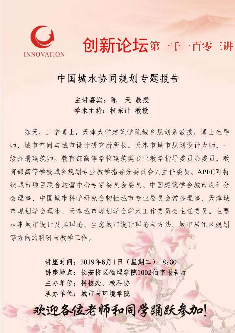 陈天 教授 星空app官网创新论坛第一千一百零三讲:中国城水协同规划专题报告 讲座时间 2021年6月1日(星期二)8:30 讲座地点 长安校区物理学院1002伯宇报告厅 讲座人介绍 陈天 教授 讲座内容