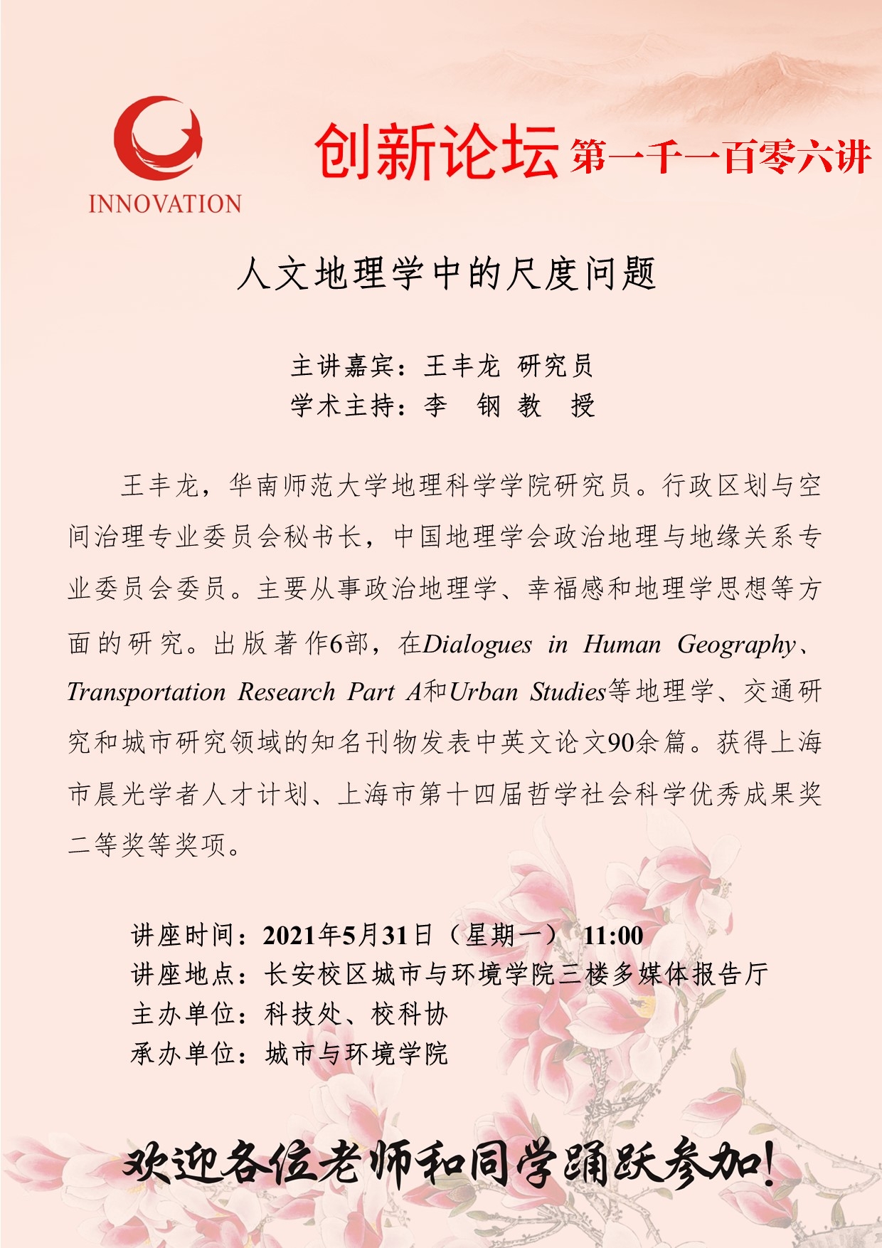 王丰龙 研究员 星空app官网创新论坛第一千一百零六讲:人文地理学中的尺度问题 讲座时间 2021年5月31日(星期一) 11:00 讲座地点 长安校区城市与环境学院三楼多媒体报告厅 讲座人介绍 王丰龙 研究员 讲座内容