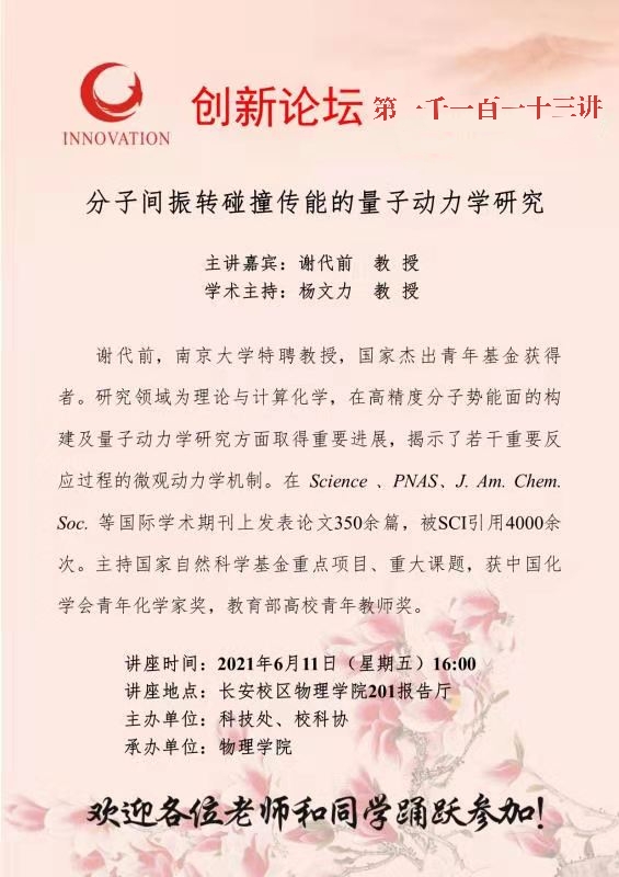 谢代前 教 授 星空app官网创新论坛第一千一百一十三讲:分子间振转碰撞传能的量子动力学研究 讲座时间 2021年6月11日(星期五)16:00 讲座地点 长安校区物理学院201报告厅 讲座人介绍 谢代前 教 授 讲座内容