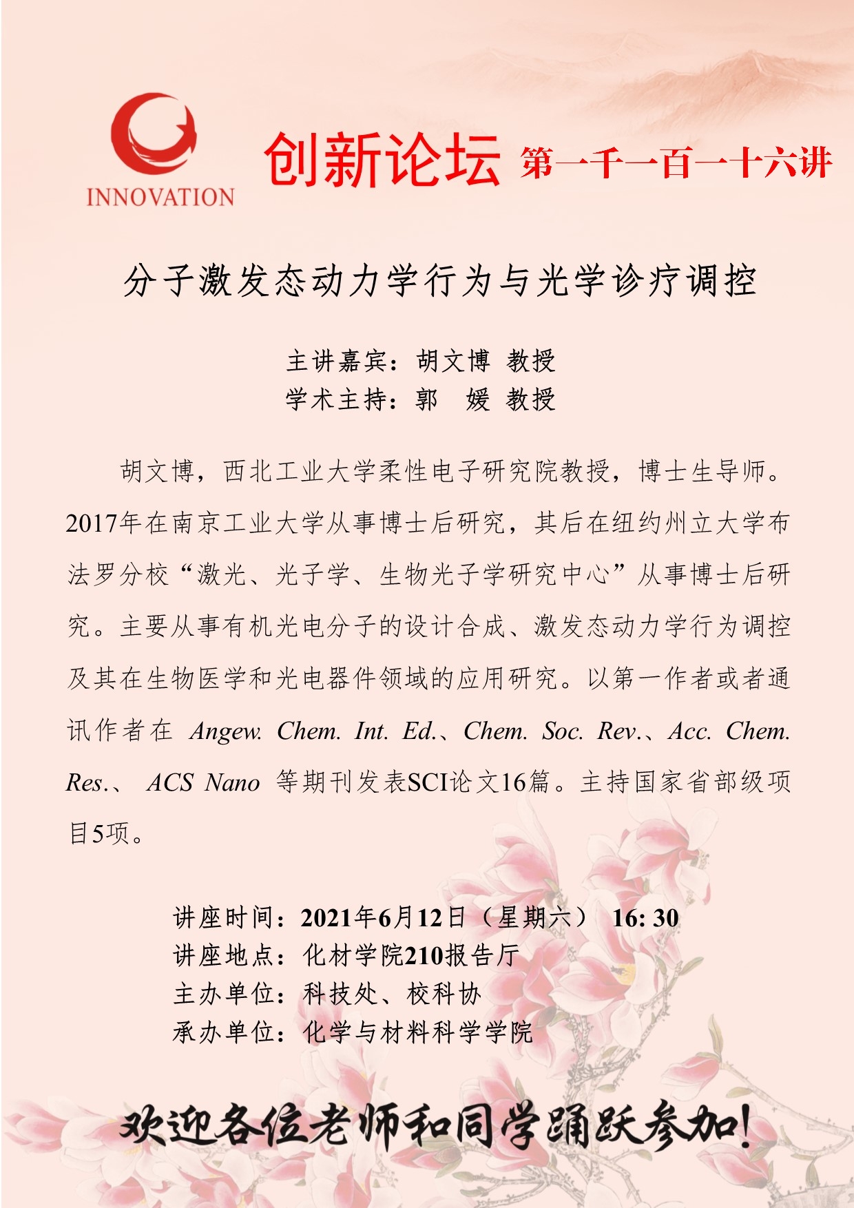 胡文博 教授 星空app官网创新论坛第一千一百一十六讲:分子激发态动力学行为与光学诊疗调控 讲座时间 2021年6月12日(星期六) 16:30 讲座地点 化材学院210报告厅 讲座人介绍 胡文博 教授 讲座内容