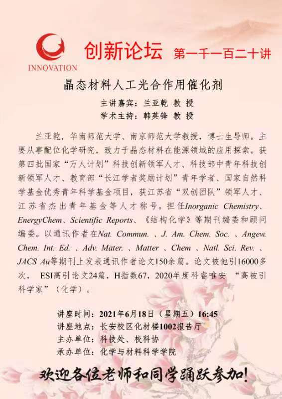 兰亚乾 教 授 星空app官网创新论坛第一千一百二十讲:晶态材料人工光合作用催化剂 讲座时间 2021年6月18日(星期五)16:45 讲座地点 长安校区化材楼1002报告厅 讲座人介绍 兰亚乾 教 授 讲座内容