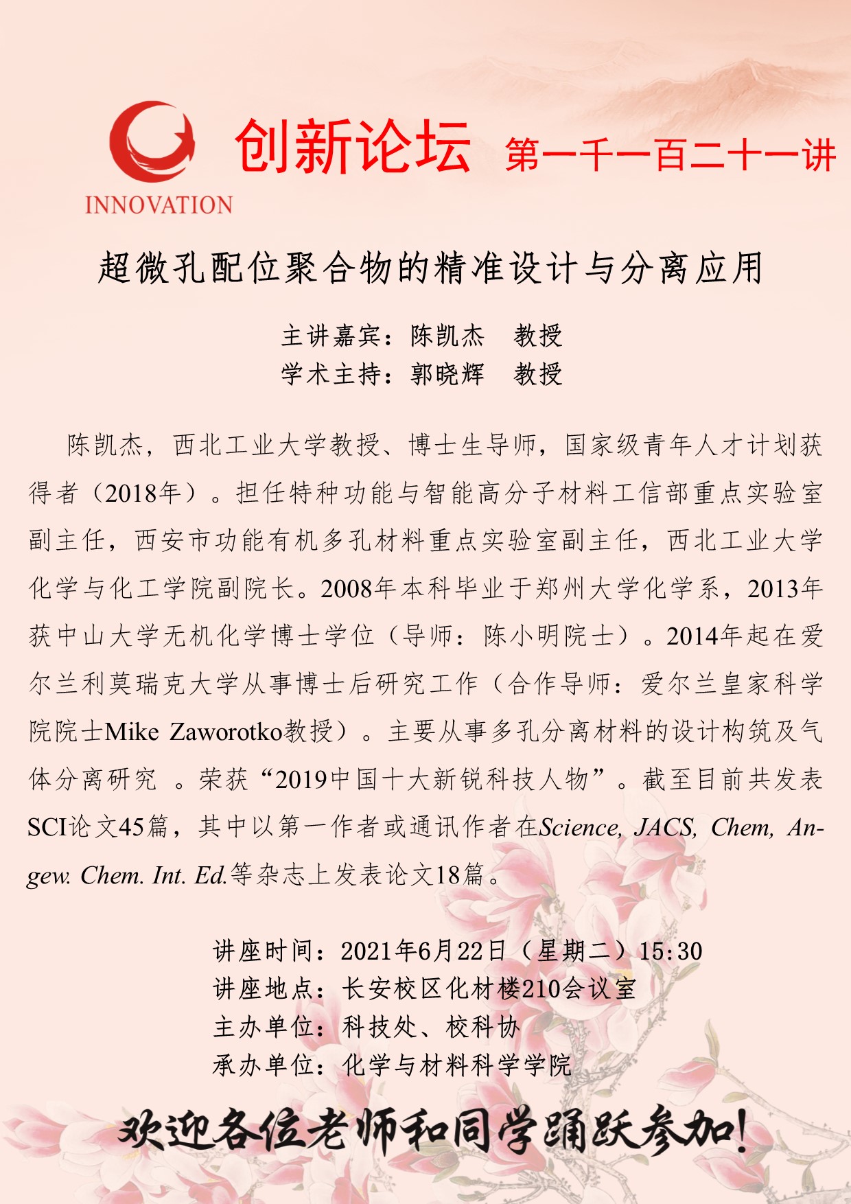 陈凯杰 教授 星空app官网创新论坛第一千一百二十一讲:超微孔配位聚合物的精准设计与分离应用 讲座时间 2021年6月22日(星期二)15:30 讲座地点 长安校区化材楼210会议室 讲座人介绍 陈凯杰 教授 讲座内容