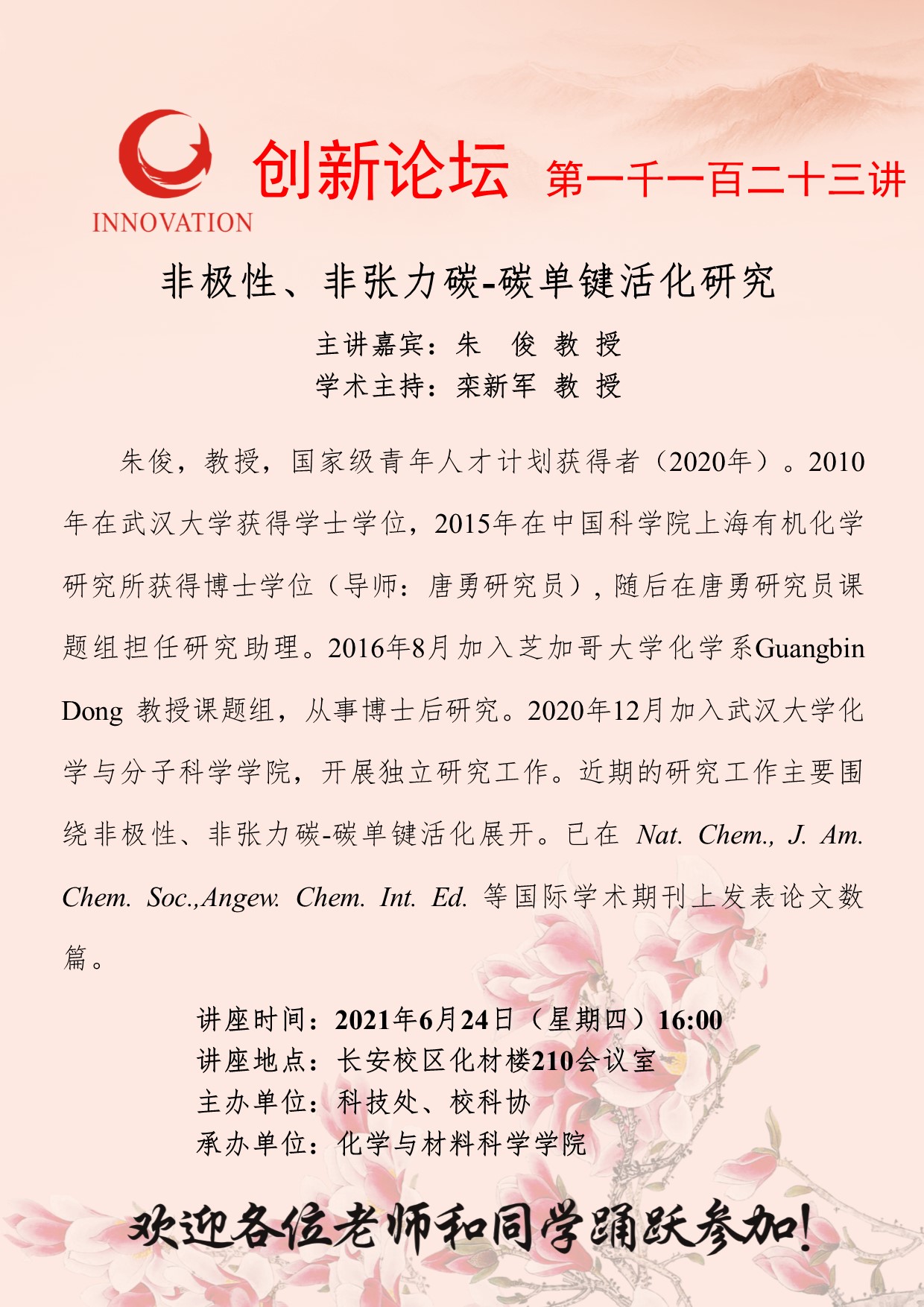 朱 俊 教 授 星空app官网创新论坛第一千一百二十三讲:非极性、非张力碳-碳单键活化研究 讲座时间 2021年6月24日(星期四)16:00 讲座地点 长安校区化材楼210会议室 讲座人介绍 朱 俊 教 授 讲座内容