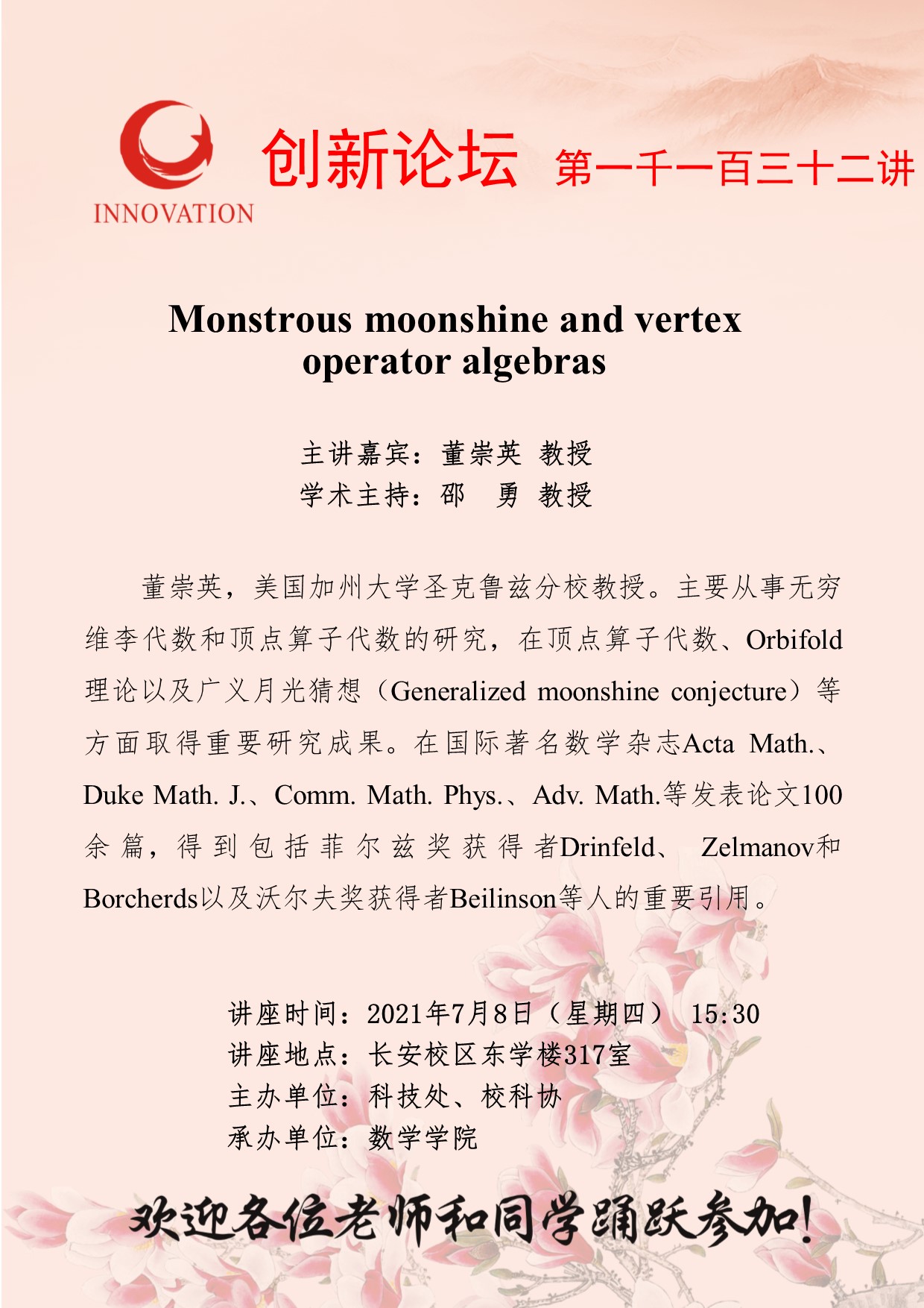 董崇英 教授 星空app官网创新论坛第一千一百三十二讲:Monstrous moonshine and vertex operator algebras 讲座时间 2021年7月8日(星期四) 讲座地点 长安校区东学楼317室 讲座人介绍 董崇英 教授 讲座内容