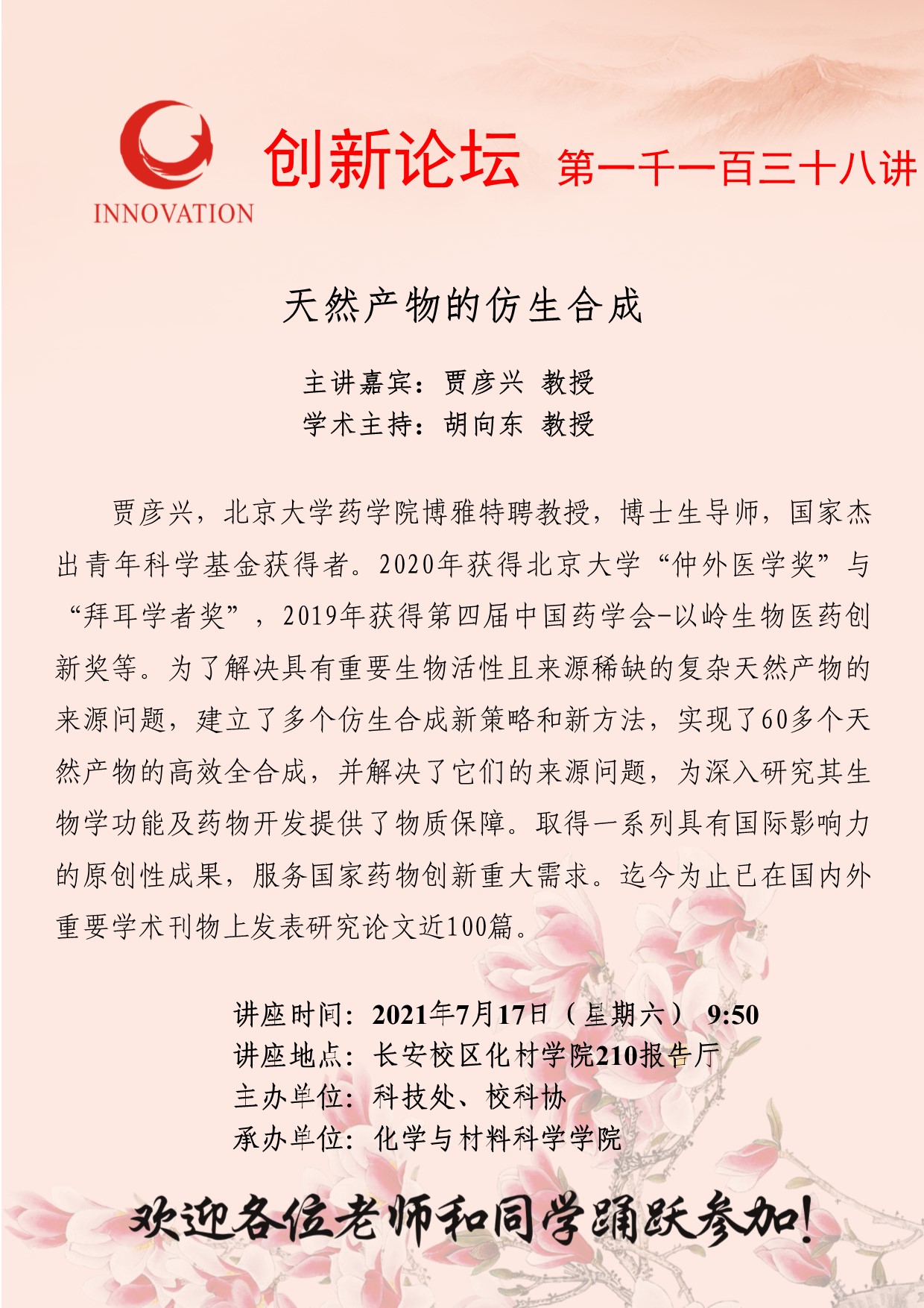 贾彦兴 教授 星空app官网创新论坛第一千一百三十八讲:天然产物的仿生合成 讲座时间 2021年7月17日(星期六) 9:50 讲座地点 长安校区化材学院210报告厅 讲座人介绍 贾彦兴 教授 讲座内容