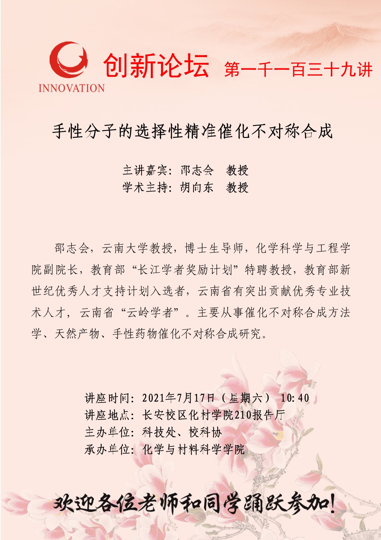 邵志会 教授 星空app官网创新论坛第一千一百三十九讲:手性分子的选择性精准催化不对称合成 讲座时间 2021年7月17日(星期六) 10:40 讲座地点 长安校区化材学院210报告厅 讲座人介绍 邵志会 教授 讲座内容