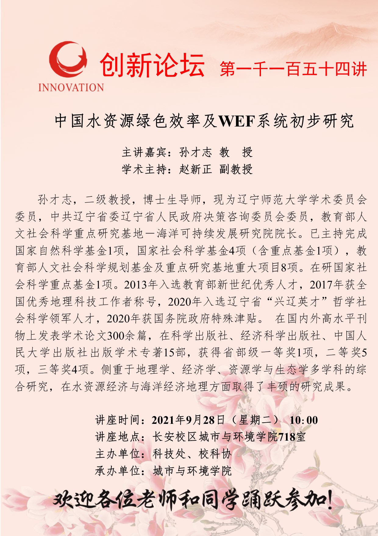 孙才志 教授 星空app官网创新论坛第一千一百五十四讲:中国水资源绿色效率及WEF系统初步研究 讲座时间 2021年9月28日(星期二) 10:00 讲座地点 长安校区城市与环境学院718室 讲座人介绍 孙才志 教授 讲座内容