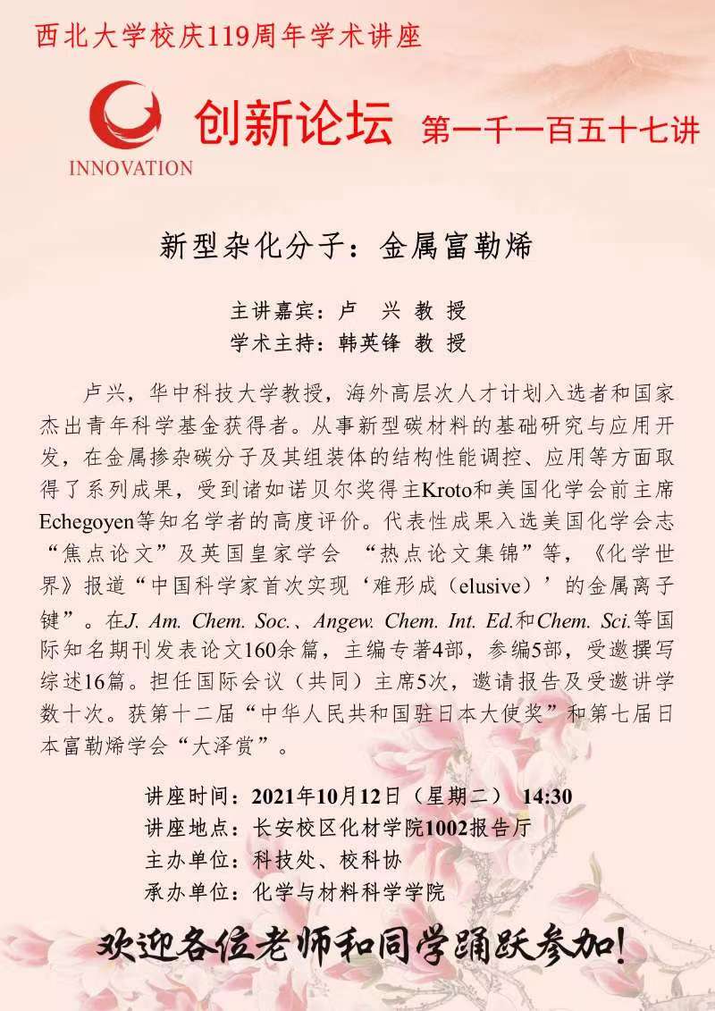 卢兴 教授 星空app官网创新论坛第一千一百五十七讲暨校庆119周年学术讲座: 新型杂化分子:金属富勒烯 讲座时间 2021年10月12日(星期二)14:30 讲座地点 长安校区化材学院1002报告厅 讲座人介绍 卢兴 教授 讲座内容